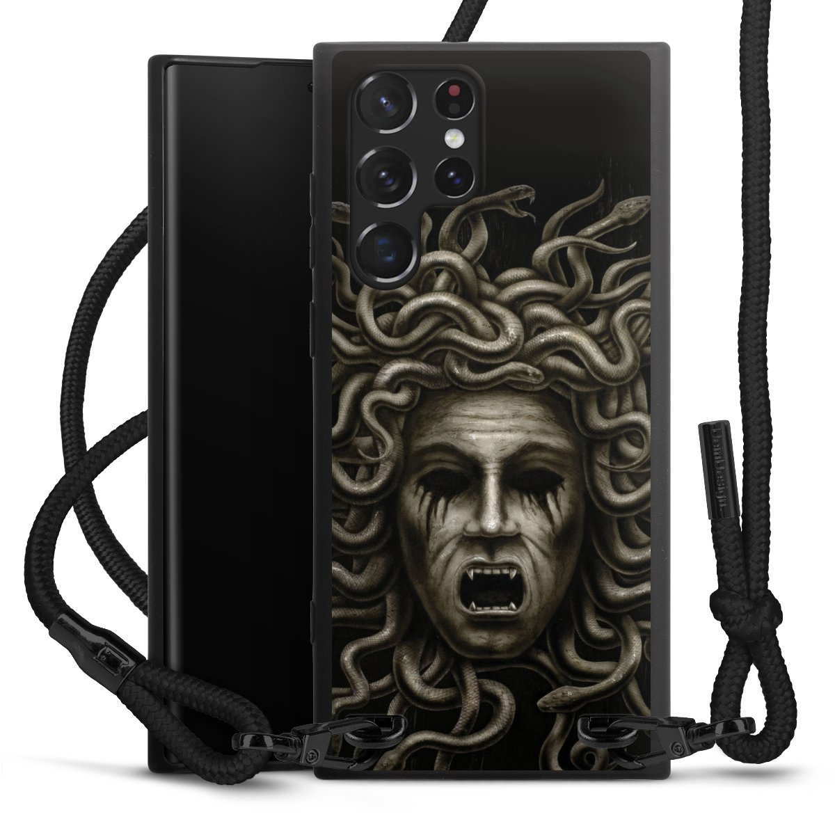 The matt black silicone case is made of flexible TPU (thermoplastic polyurethane) and offers robust protection. The durable, unbreakable material makes the cover flexible and dimensionally stable at the same time. The matte surface makes your design stand out more and is less susceptible to fingerprints and dirt. The stylish trend accessory fits comfortably in the hand and is perfectly complemented by the fabric (polyester) mobile phone strap. The braided fabric strap is approx. 1.70 metres long with a diameter of approx. 0.5 cm. Due to the special knotting technique, the length of the strap can be adjusted by simply pulling it, so that you can adapt it individually to your wishes. The practical case to wear around your neck is available with the fabric strap in black. As a little icing on the cake, we have provided the strap with a chic metal fastener in matt black. The strap is securely fastened to the case with loops made of high-quality genuine leather and press studs. The ends of the fabric strap are covered with metallic end caps and thus protected from fraying.