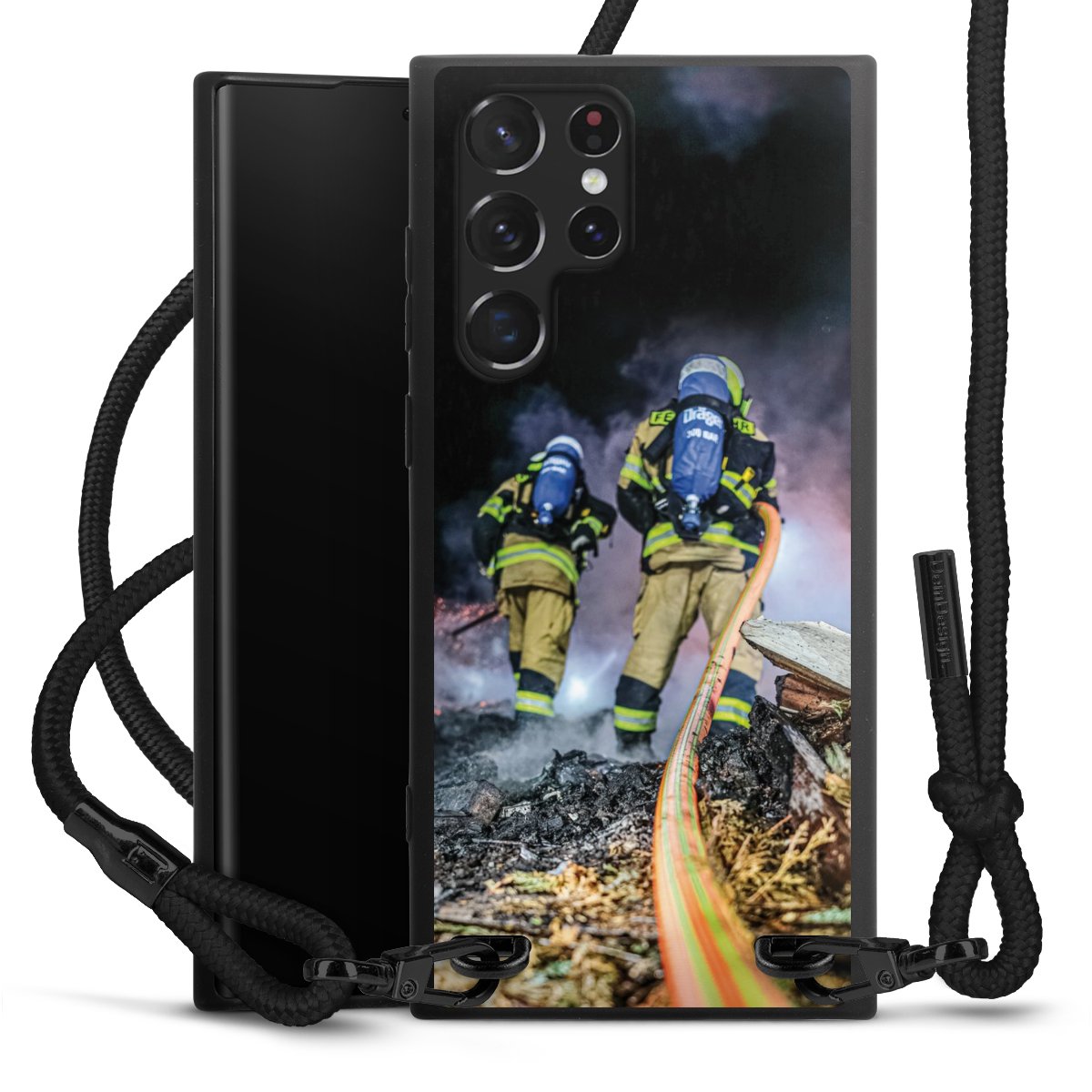 The matt black silicone case is made of flexible TPU (thermoplastic polyurethane) and offers robust protection. The durable, unbreakable material makes the cover flexible and dimensionally stable at the same time. The matte surface makes your design stand out more and is less susceptible to fingerprints and dirt. The stylish trend accessory fits comfortably in the hand and is perfectly complemented by the fabric (polyester) mobile phone strap. The braided fabric strap is approx. 1.70 metres long with a diameter of approx. 0.5 cm. Due to the special knotting technique, the length of the strap can be adjusted by simply pulling it, so that you can adapt it individually to your wishes. The practical case to wear around your neck is available with the fabric strap in black. As a little icing on the cake, we have provided the strap with a chic metal fastener in matt black. The strap is securely fastened to the case with loops made of high-quality genuine leather and press studs. The ends of the fabric strap are covered with metallic end caps and thus protected from fraying.