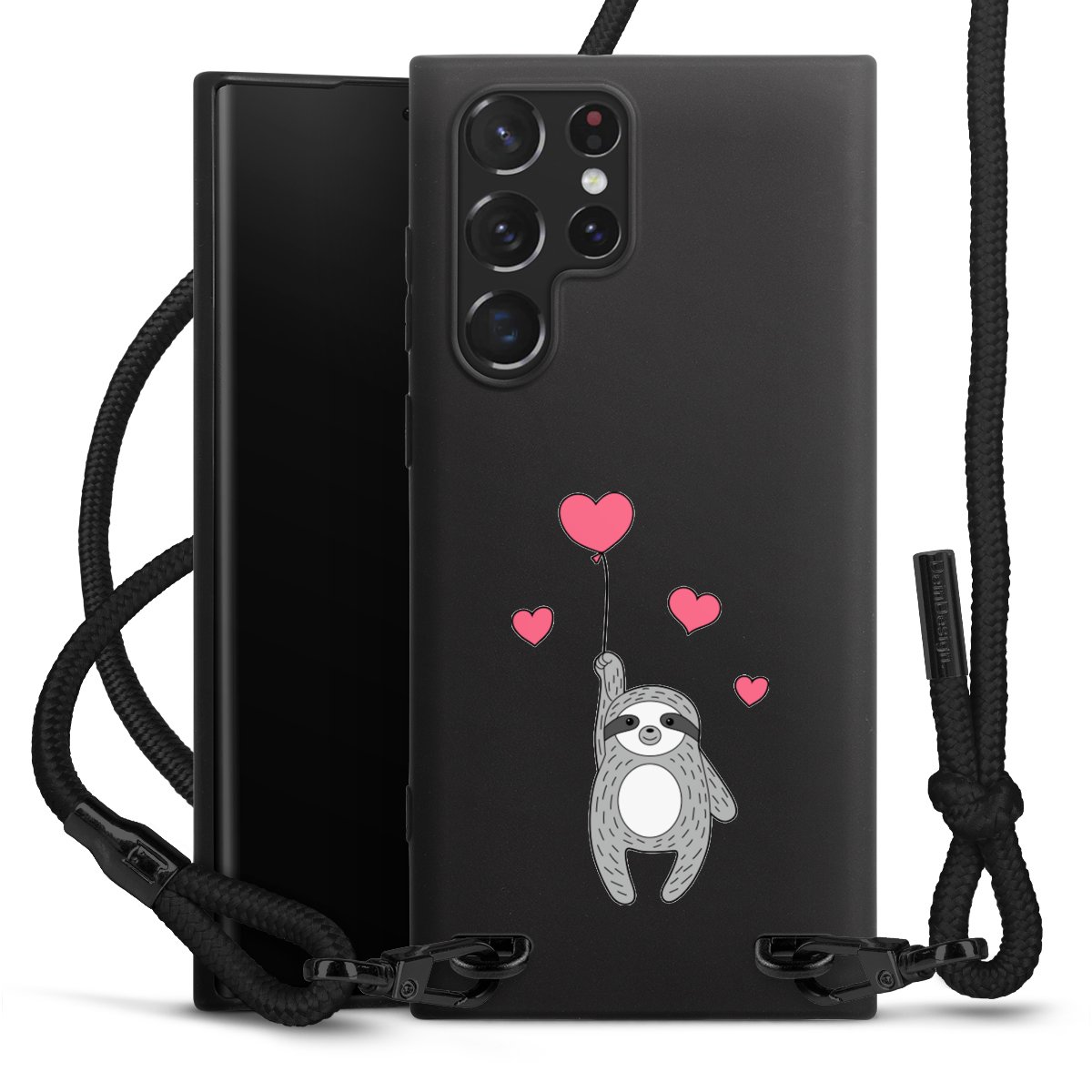The matt black silicone case is made of flexible TPU (thermoplastic polyurethane) and offers robust protection. The durable, unbreakable material makes the cover flexible and dimensionally stable at the same time. The matte surface makes your design stand out more and is less susceptible to fingerprints and dirt. The stylish trend accessory fits comfortably in the hand and is perfectly complemented by the fabric (polyester) mobile phone strap. The braided fabric strap is approx. 1.70 metres long with a diameter of approx. 0.5 cm. Due to the special knotting technique, the length of the strap can be adjusted by simply pulling it, so that you can adapt it individually to your wishes. The practical case to wear around your neck is available with the fabric strap in black. As a little icing on the cake, we have provided the strap with a chic metal fastener in matt black. The strap is securely fastened to the case with loops made of high-quality genuine leather and press studs. The ends of the fabric strap are covered with metallic end caps and thus protected from fraying.
