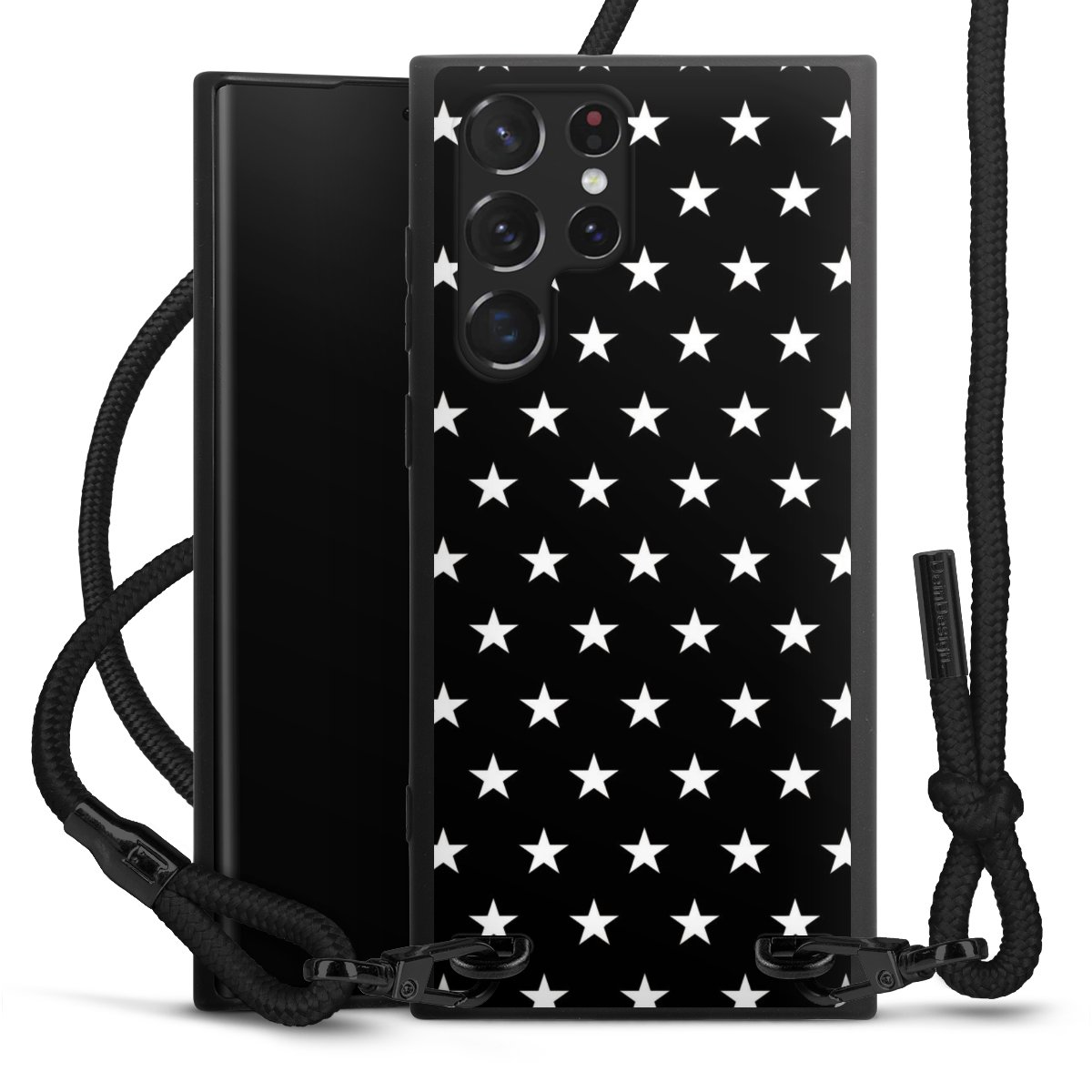 The matt black silicone case is made of flexible TPU (thermoplastic polyurethane) and offers robust protection. The durable, unbreakable material makes the cover flexible and dimensionally stable at the same time. The matte surface makes your design stand out more and is less susceptible to fingerprints and dirt. The stylish trend accessory fits comfortably in the hand and is perfectly complemented by the fabric (polyester) mobile phone strap. The braided fabric strap is approx. 1.70 metres long with a diameter of approx. 0.5 cm. Due to the special knotting technique, the length of the strap can be adjusted by simply pulling it, so that you can adapt it individually to your wishes. The practical case to wear around your neck is available with the fabric strap in black. As a little icing on the cake, we have provided the strap with a chic metal fastener in matt black. The strap is securely fastened to the case with loops made of high-quality genuine leather and press studs. The ends of the fabric strap are covered with metallic end caps and thus protected from fraying.