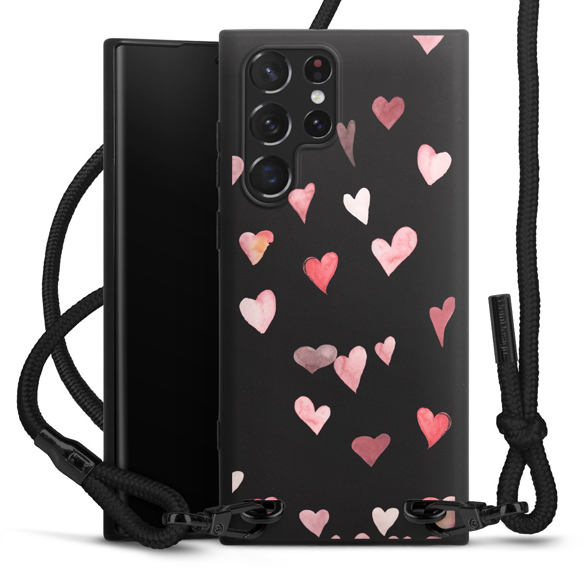 The matt black silicone case is made of flexible TPU (thermoplastic polyurethane) and offers robust protection. The durable, unbreakable material makes the cover flexible and dimensionally stable at the same time. The matte surface makes your design stand out more and is less susceptible to fingerprints and dirt. The stylish trend accessory fits comfortably in the hand and is perfectly complemented by the fabric (polyester) mobile phone strap. The braided fabric strap is approx. 1.70 metres long with a diameter of approx. 0.5 cm. Due to the special knotting technique, the length of the strap can be adjusted by simply pulling it, so that you can adapt it individually to your wishes. The practical case to wear around your neck is available with the fabric strap in black. As a little icing on the cake, we have provided the strap with a chic metal fastener in matt black. The strap is securely fastened to the case with loops made of high-quality genuine leather and press studs. The ends of the fabric strap are covered with metallic end caps and thus protected from fraying.