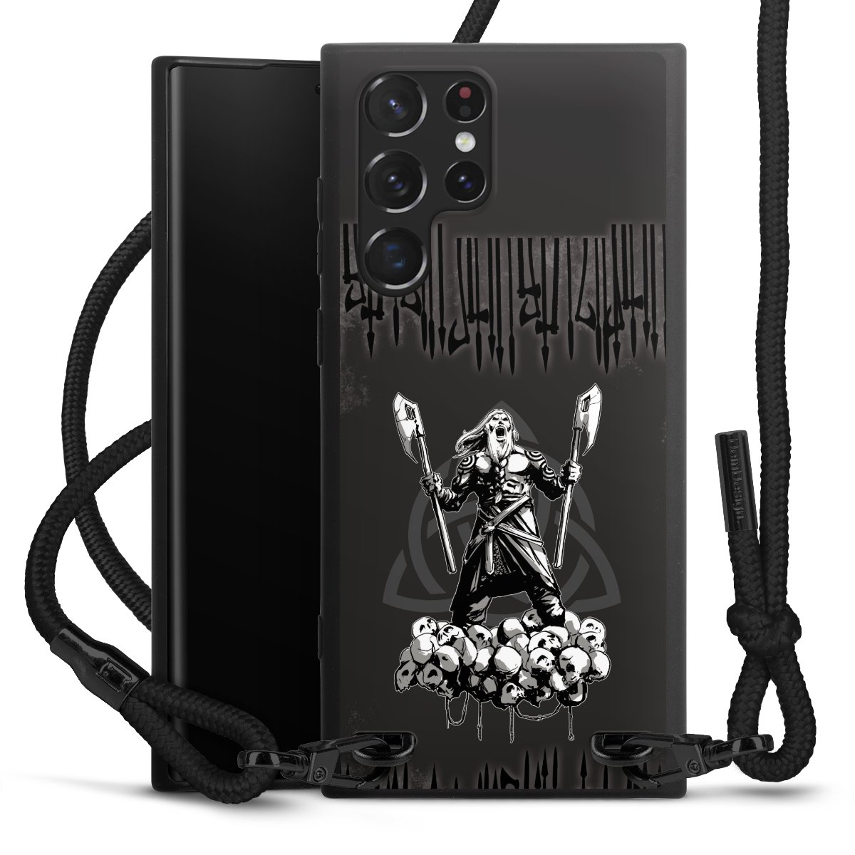 The matt black silicone case is made of flexible TPU (thermoplastic polyurethane) and offers robust protection. The durable, unbreakable material makes the cover flexible and dimensionally stable at the same time. The matte surface makes your design stand out more and is less susceptible to fingerprints and dirt. The stylish trend accessory fits comfortably in the hand and is perfectly complemented by the fabric (polyester) mobile phone strap. The braided fabric strap is approx. 1.70 metres long with a diameter of approx. 0.5 cm. Due to the special knotting technique, the length of the strap can be adjusted by simply pulling it, so that you can adapt it individually to your wishes. The practical case to wear around your neck is available with the fabric strap in black. As a little icing on the cake, we have provided the strap with a chic metal fastener in matt black. The strap is securely fastened to the case with loops made of high-quality genuine leather and press studs. The ends of the fabric strap are covered with metallic end caps and thus protected from fraying.