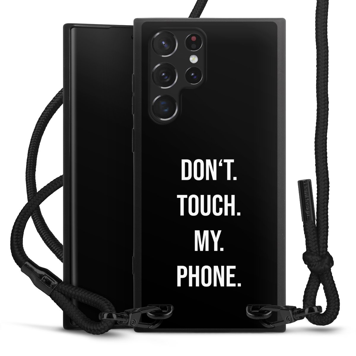 The matt black silicone case is made of flexible TPU (thermoplastic polyurethane) and offers robust protection. The durable, unbreakable material makes the cover flexible and dimensionally stable at the same time. The matte surface makes your design stand out more and is less susceptible to fingerprints and dirt. The stylish trend accessory fits comfortably in the hand and is perfectly complemented by the fabric (polyester) mobile phone strap. The braided fabric strap is approx. 1.70 metres long with a diameter of approx. 0.5 cm. Due to the special knotting technique, the length of the strap can be adjusted by simply pulling it, so that you can adapt it individually to your wishes. The practical case to wear around your neck is available with the fabric strap in black. As a little icing on the cake, we have provided the strap with a chic metal fastener in matt black. The strap is securely fastened to the case with loops made of high-quality genuine leather and press studs. The ends of the fabric strap are covered with metallic end caps and thus protected from fraying.