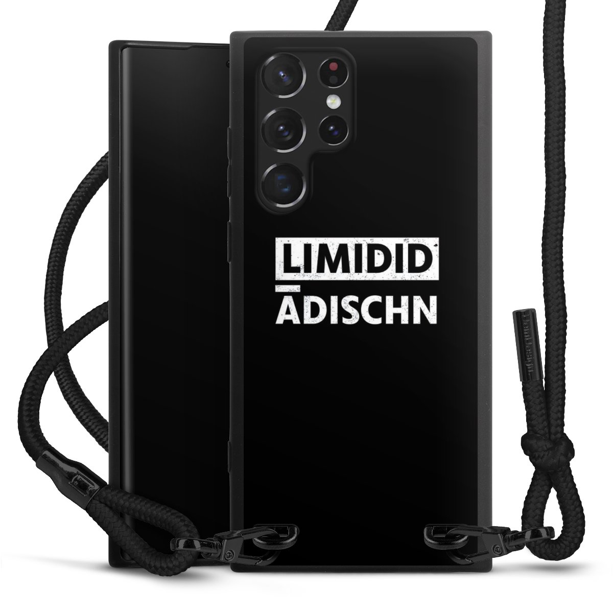 The matt black silicone case is made of flexible TPU (thermoplastic polyurethane) and offers robust protection. The durable, unbreakable material makes the cover flexible and dimensionally stable at the same time. The matte surface makes your design stand out more and is less susceptible to fingerprints and dirt. The stylish trend accessory fits comfortably in the hand and is perfectly complemented by the fabric (polyester) mobile phone strap. The braided fabric strap is approx. 1.70 metres long with a diameter of approx. 0.5 cm. Due to the special knotting technique, the length of the strap can be adjusted by simply pulling it, so that you can adapt it individually to your wishes. The practical case to wear around your neck is available with the fabric strap in black. As a little icing on the cake, we have provided the strap with a chic metal fastener in matt black. The strap is securely fastened to the case with loops made of high-quality genuine leather and press studs. The ends of the fabric strap are covered with metallic end caps and thus protected from fraying.