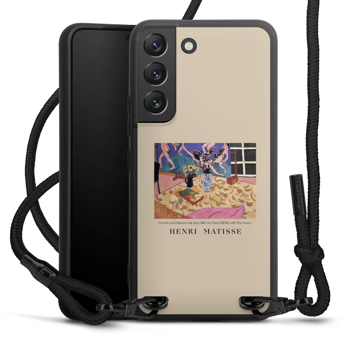 The matt black silicone case is made of flexible TPU (thermoplastic polyurethane) and offers robust protection. The durable, unbreakable material makes the cover flexible and dimensionally stable at the same time. The matte surface makes your design stand out more and is less susceptible to fingerprints and dirt. The stylish trend accessory fits comfortably in the hand and is perfectly complemented by the fabric (polyester) mobile phone strap. The braided fabric strap is approx. 1.70 metres long with a diameter of approx. 0.5 cm. Due to the special knotting technique, the length of the strap can be adjusted by simply pulling it, so that you can adapt it individually to your wishes. The practical case to wear around your neck is available with the fabric strap in black. As a little icing on the cake, we have provided the strap with a chic metal fastener in matt black. The strap is securely fastened to the case with loops made of high-quality genuine leather and press studs. The ends of the fabric strap are covered with metallic end caps and thus protected from fraying.