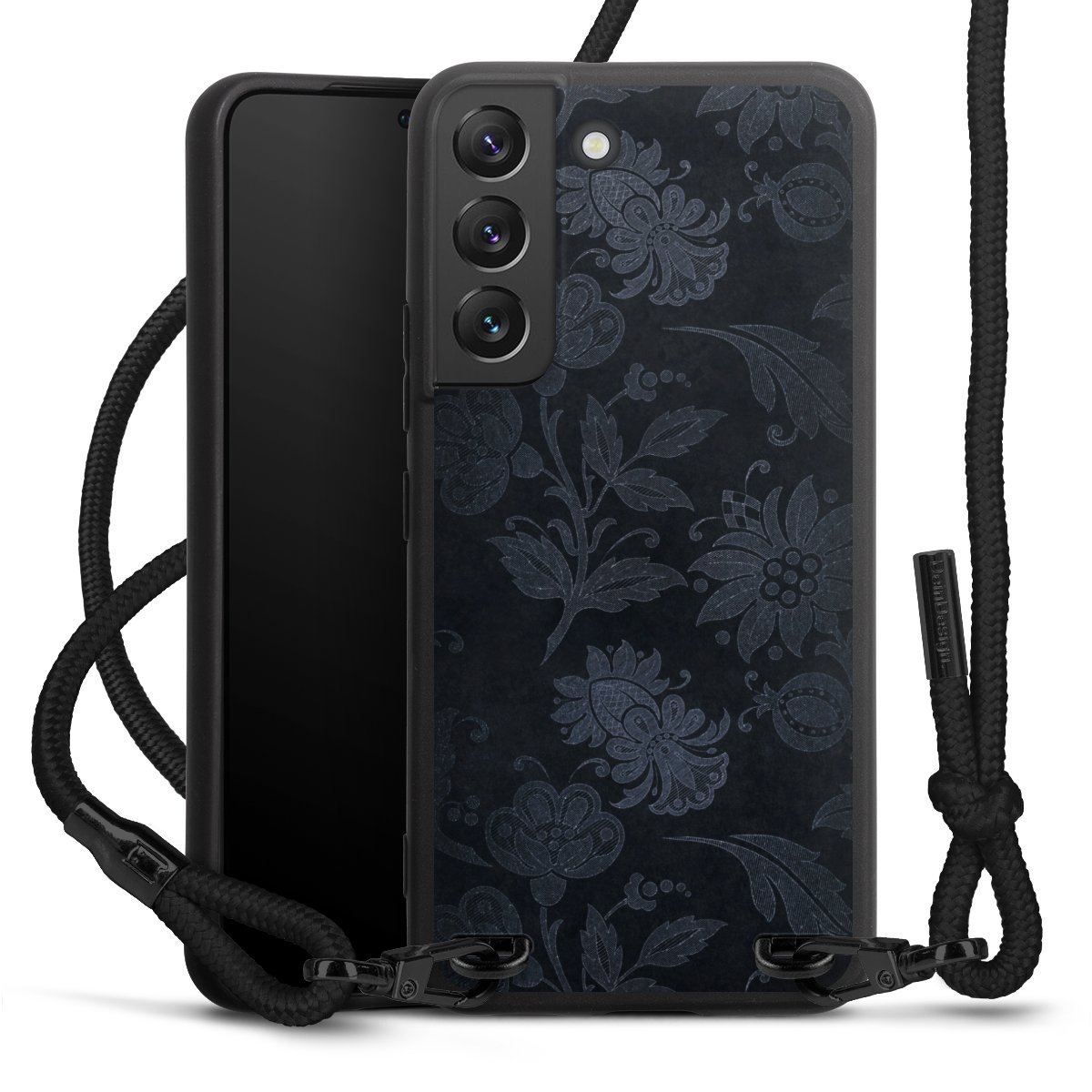 The matt black silicone case is made of flexible TPU (thermoplastic polyurethane) and offers robust protection. The durable, unbreakable material makes the cover flexible and dimensionally stable at the same time. The matte surface makes your design stand out more and is less susceptible to fingerprints and dirt. The stylish trend accessory fits comfortably in the hand and is perfectly complemented by the fabric (polyester) mobile phone strap. The braided fabric strap is approx. 1.70 metres long with a diameter of approx. 0.5 cm. Due to the special knotting technique, the length of the strap can be adjusted by simply pulling it, so that you can adapt it individually to your wishes. The practical case to wear around your neck is available with the fabric strap in black. As a little icing on the cake, we have provided the strap with a chic metal fastener in matt black. The strap is securely fastened to the case with loops made of high-quality genuine leather and press studs. The ends of the fabric strap are covered with metallic end caps and thus protected from fraying.