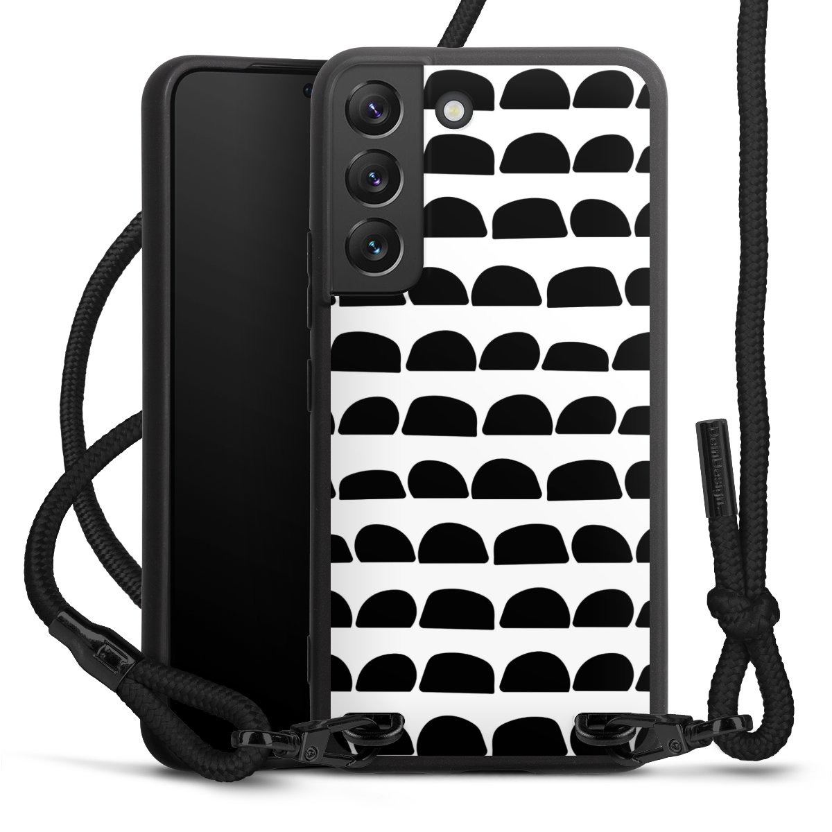 The matt black silicone case is made of flexible TPU (thermoplastic polyurethane) and offers robust protection. The durable, unbreakable material makes the cover flexible and dimensionally stable at the same time. The matte surface makes your design stand out more and is less susceptible to fingerprints and dirt. The stylish trend accessory fits comfortably in the hand and is perfectly complemented by the fabric (polyester) mobile phone strap. The braided fabric strap is approx. 1.70 metres long with a diameter of approx. 0.5 cm. Due to the special knotting technique, the length of the strap can be adjusted by simply pulling it, so that you can adapt it individually to your wishes. The practical case to wear around your neck is available with the fabric strap in black. As a little icing on the cake, we have provided the strap with a chic metal fastener in matt black. The strap is securely fastened to the case with loops made of high-quality genuine leather and press studs. The ends of the fabric strap are covered with metallic end caps and thus protected from fraying.