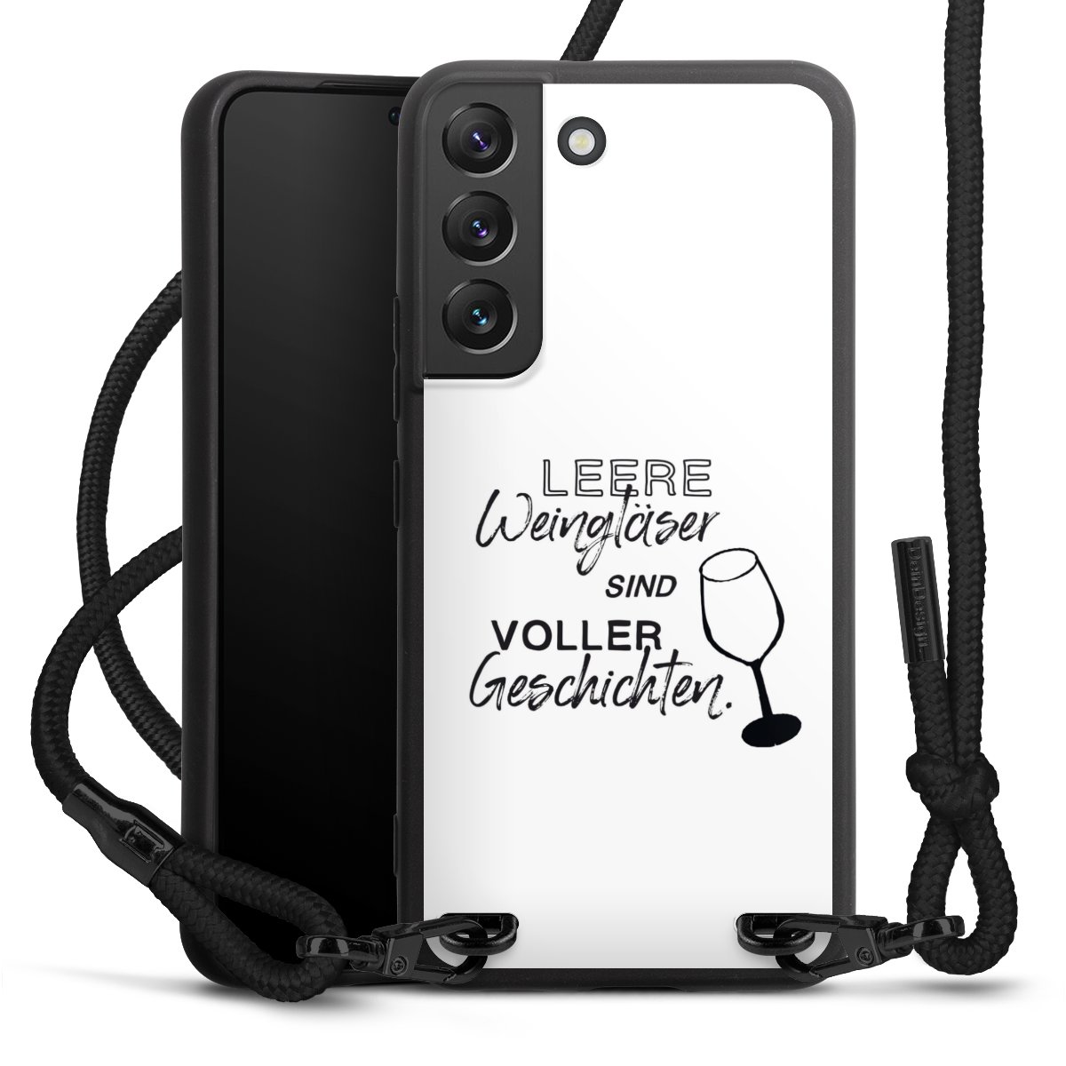 The matt black silicone case is made of flexible TPU (thermoplastic polyurethane) and offers robust protection. The durable, unbreakable material makes the cover flexible and dimensionally stable at the same time. The matte surface makes your design stand out more and is less susceptible to fingerprints and dirt. The stylish trend accessory fits comfortably in the hand and is perfectly complemented by the fabric (polyester) mobile phone strap. The braided fabric strap is approx. 1.70 metres long with a diameter of approx. 0.5 cm. Due to the special knotting technique, the length of the strap can be adjusted by simply pulling it, so that you can adapt it individually to your wishes. The practical case to wear around your neck is available with the fabric strap in black. As a little icing on the cake, we have provided the strap with a chic metal fastener in matt black. The strap is securely fastened to the case with loops made of high-quality genuine leather and press studs. The ends of the fabric strap are covered with metallic end caps and thus protected from fraying.