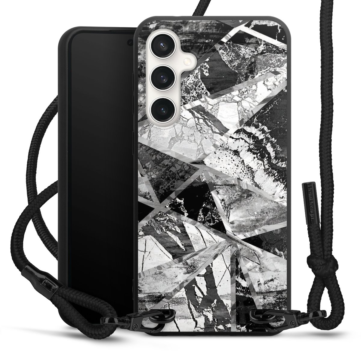 Pure Black: Phone case, fabric strap and metal details in stylish matt black.