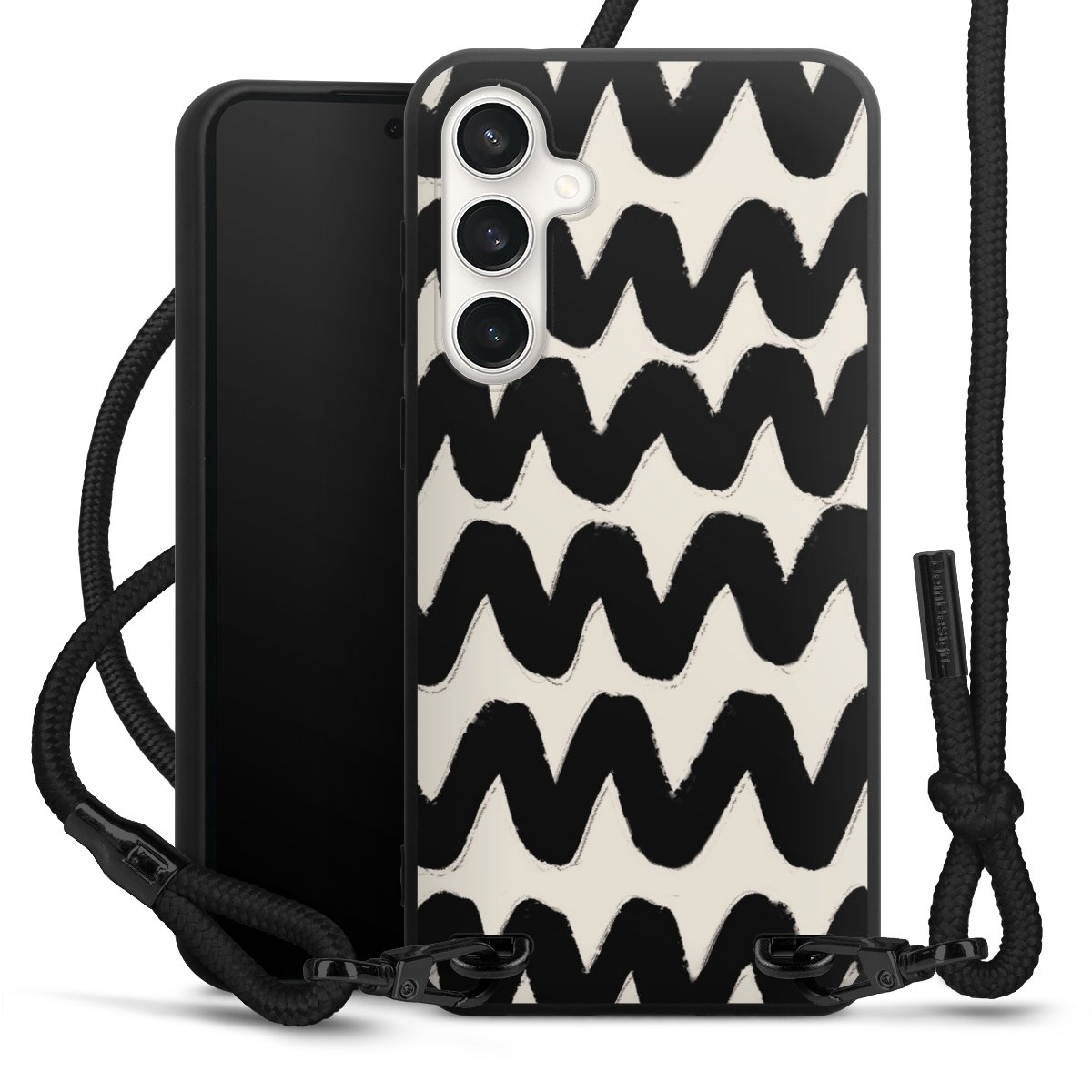 The matt black silicone case is made of flexible TPU (thermoplastic polyurethane) and offers robust protection. The durable, unbreakable material makes the cover flexible and dimensionally stable at the same time. The matte surface makes your design stand out more and is less susceptible to fingerprints and dirt. The stylish trend accessory fits comfortably in the hand and is perfectly complemented by the fabric (polyester) mobile phone strap. The braided fabric strap is approx. 1.70 metres long with a diameter of approx. 0.5 cm. Due to the special knotting technique, the length of the strap can be adjusted by simply pulling it, so that you can adapt it individually to your wishes. The practical case to wear around your neck is available with the fabric strap in black. As a little icing on the cake, we have provided the strap with a chic metal fastener in matt black. The strap is securely fastened to the case with loops made of high-quality genuine leather and press studs. The ends of the fabric strap are covered with metallic end caps and thus protected from fraying.