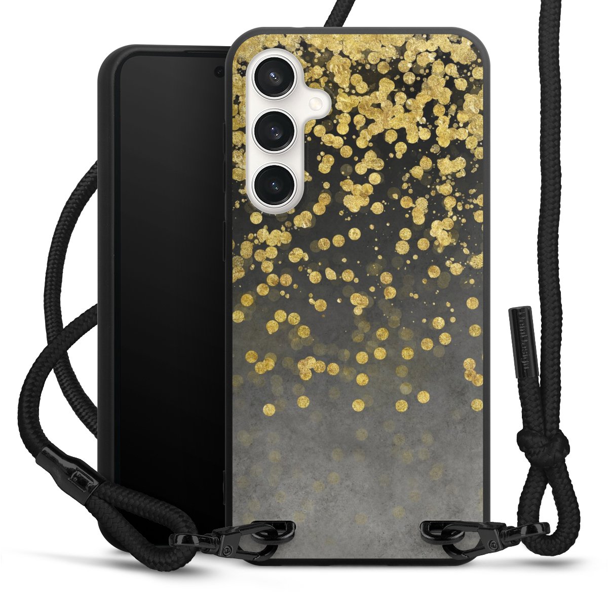 The matt black silicone case is made of flexible TPU (thermoplastic polyurethane) and offers robust protection. The durable, unbreakable material makes the cover flexible and dimensionally stable at the same time. The matte surface makes your design stand out more and is less susceptible to fingerprints and dirt. The stylish trend accessory fits comfortably in the hand and is perfectly complemented by the fabric (polyester) mobile phone strap. The braided fabric strap is approx. 1.70 metres long with a diameter of approx. 0.5 cm. Due to the special knotting technique, the length of the strap can be adjusted by simply pulling it, so that you can adapt it individually to your wishes. The practical case to wear around your neck is available with the fabric strap in black. As a little icing on the cake, we have provided the strap with a chic metal fastener in matt black. The strap is securely fastened to the case with loops made of high-quality genuine leather and press studs. The ends of the fabric strap are covered with metallic end caps and thus protected from fraying.