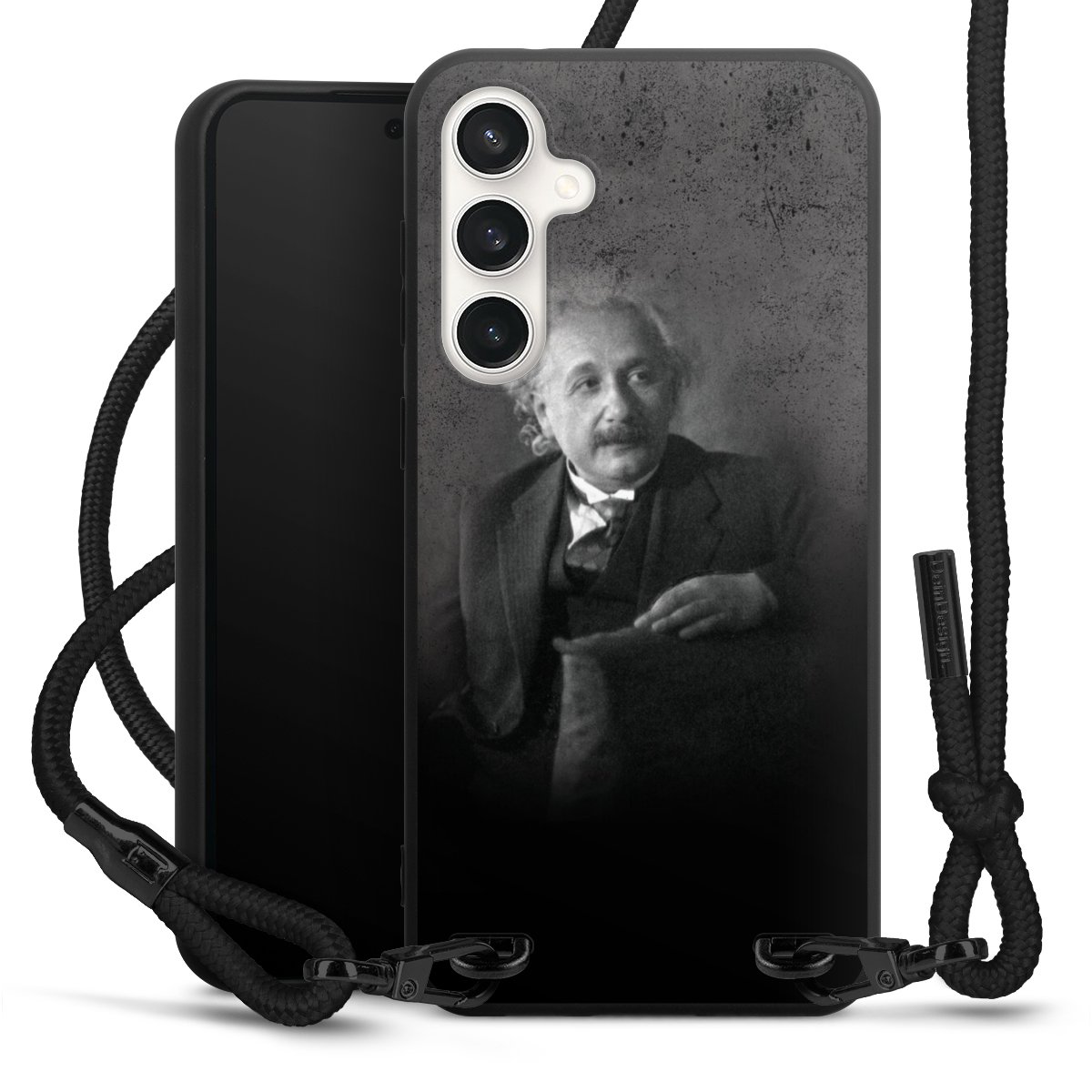The matt black silicone case is made of flexible TPU (thermoplastic polyurethane) and offers robust protection. The durable, unbreakable material makes the cover flexible and dimensionally stable at the same time. The matte surface makes your design stand out more and is less susceptible to fingerprints and dirt. The stylish trend accessory fits comfortably in the hand and is perfectly complemented by the fabric (polyester) mobile phone strap. The braided fabric strap is approx. 1.70 metres long with a diameter of approx. 0.5 cm. Due to the special knotting technique, the length of the strap can be adjusted by simply pulling it, so that you can adapt it individually to your wishes. The practical case to wear around your neck is available with the fabric strap in black. As a little icing on the cake, we have provided the strap with a chic metal fastener in matt black. The strap is securely fastened to the case with loops made of high-quality genuine leather and press studs. The ends of the fabric strap are covered with metallic end caps and thus protected from fraying.