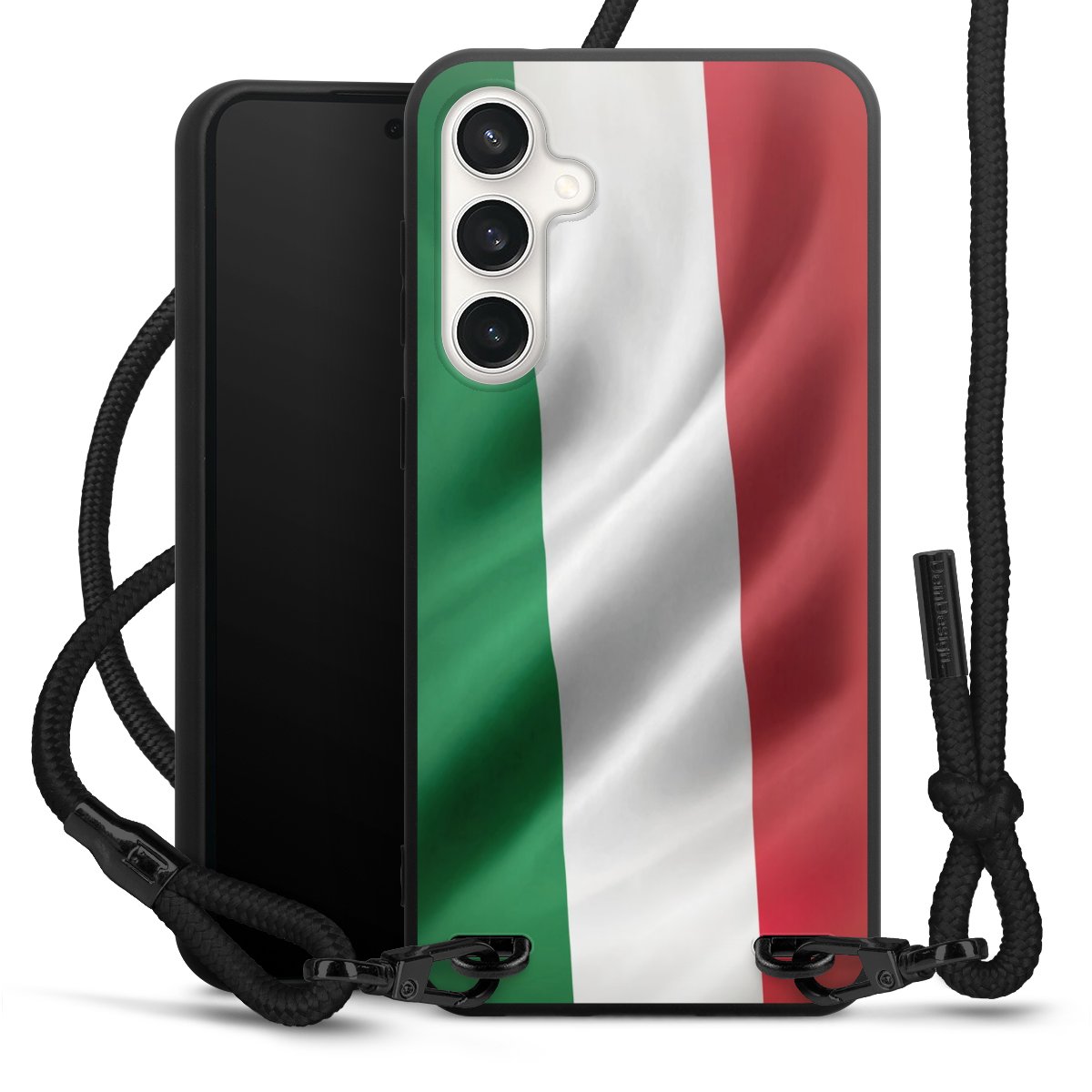 The matt black silicone case is made of flexible TPU (thermoplastic polyurethane) and offers robust protection. The durable, unbreakable material makes the cover flexible and dimensionally stable at the same time. The matte surface makes your design stand out more and is less susceptible to fingerprints and dirt. The stylish trend accessory fits comfortably in the hand and is perfectly complemented by the fabric (polyester) mobile phone strap. The braided fabric strap is approx. 1.70 metres long with a diameter of approx. 0.5 cm. Due to the special knotting technique, the length of the strap can be adjusted by simply pulling it, so that you can adapt it individually to your wishes. The practical case to wear around your neck is available with the fabric strap in black. As a little icing on the cake, we have provided the strap with a chic metal fastener in matt black. The strap is securely fastened to the case with loops made of high-quality genuine leather and press studs. The ends of the fabric strap are covered with metallic end caps and thus protected from fraying.