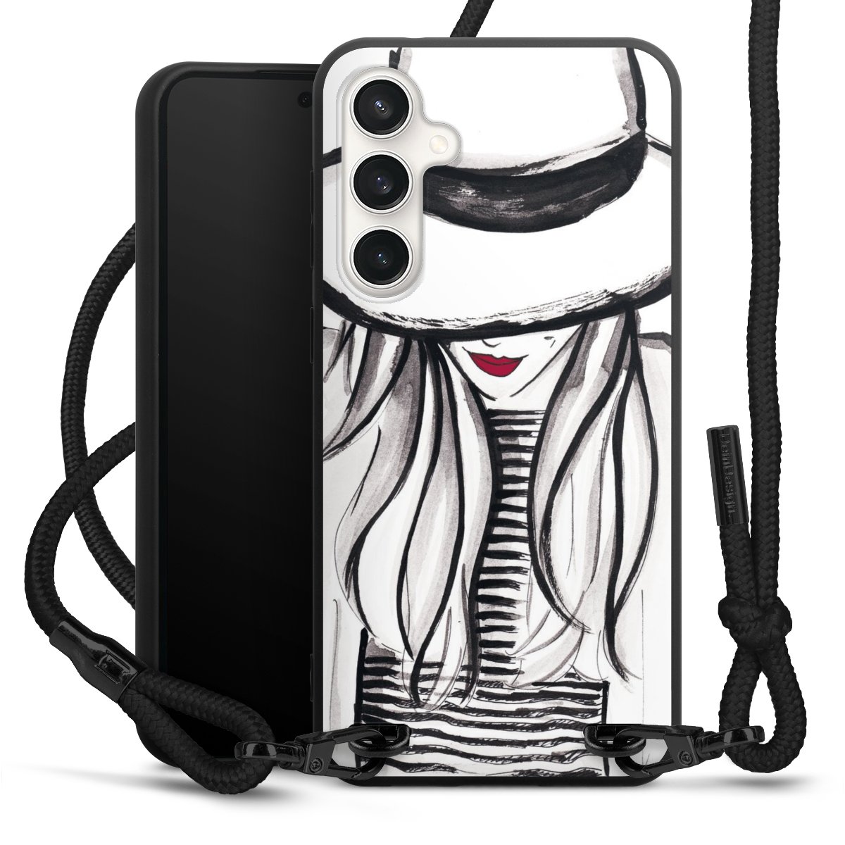 The matt black silicone case is made of flexible TPU (thermoplastic polyurethane) and offers robust protection. The durable, unbreakable material makes the cover flexible and dimensionally stable at the same time. The matte surface makes your design stand out more and is less susceptible to fingerprints and dirt. The stylish trend accessory fits comfortably in the hand and is perfectly complemented by the fabric (polyester) mobile phone strap. The braided fabric strap is approx. 1.70 metres long with a diameter of approx. 0.5 cm. Due to the special knotting technique, the length of the strap can be adjusted by simply pulling it, so that you can adapt it individually to your wishes. The practical case to wear around your neck is available with the fabric strap in black. As a little icing on the cake, we have provided the strap with a chic metal fastener in matt black. The strap is securely fastened to the case with loops made of high-quality genuine leather and press studs. The ends of the fabric strap are covered with metallic end caps and thus protected from fraying.