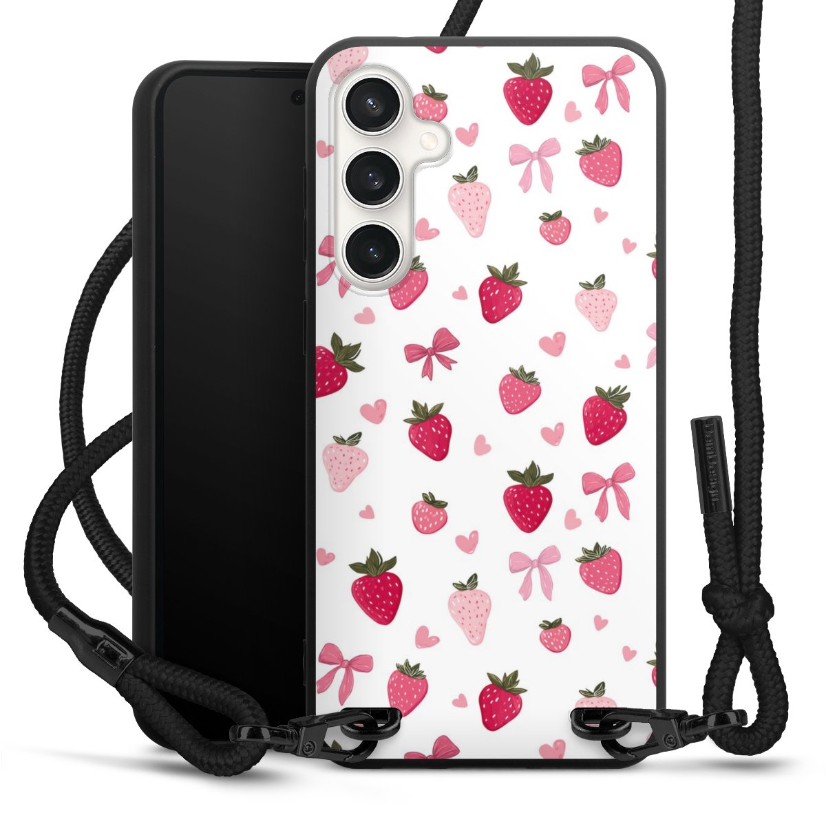 The matt black silicone case is made of flexible TPU (thermoplastic polyurethane) and offers robust protection. The durable, unbreakable material makes the cover flexible and dimensionally stable at the same time. The matte surface makes your design stand out more and is less susceptible to fingerprints and dirt. The stylish trend accessory fits comfortably in the hand and is perfectly complemented by the fabric (polyester) mobile phone strap. The braided fabric strap is approx. 1.70 metres long with a diameter of approx. 0.5 cm. Due to the special knotting technique, the length of the strap can be adjusted by simply pulling it, so that you can adapt it individually to your wishes. The practical case to wear around your neck is available with the fabric strap in black. As a little icing on the cake, we have provided the strap with a chic metal fastener in matt black. The strap is securely fastened to the case with loops made of high-quality genuine leather and press studs. The ends of the fabric strap are covered with metallic end caps and thus protected from fraying.