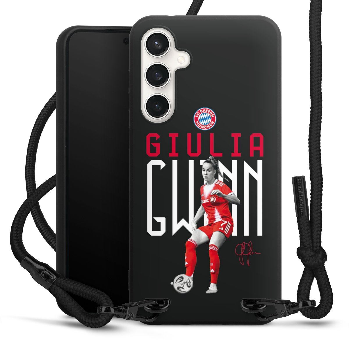The matt black silicone case is made of flexible TPU (thermoplastic polyurethane) and offers robust protection. The durable, unbreakable material makes the cover flexible and dimensionally stable at the same time. The matte surface makes your design stand out more and is less susceptible to fingerprints and dirt. The stylish trend accessory fits comfortably in the hand and is perfectly complemented by the fabric (polyester) mobile phone strap. The braided fabric strap is approx. 1.70 metres long with a diameter of approx. 0.5 cm. Due to the special knotting technique, the length of the strap can be adjusted by simply pulling it, so that you can adapt it individually to your wishes. The practical case to wear around your neck is available with the fabric strap in black. As a little icing on the cake, we have provided the strap with a chic metal fastener in matt black. The strap is securely fastened to the case with loops made of high-quality genuine leather and press studs. The ends of the fabric strap are covered with metallic end caps and thus protected from fraying.