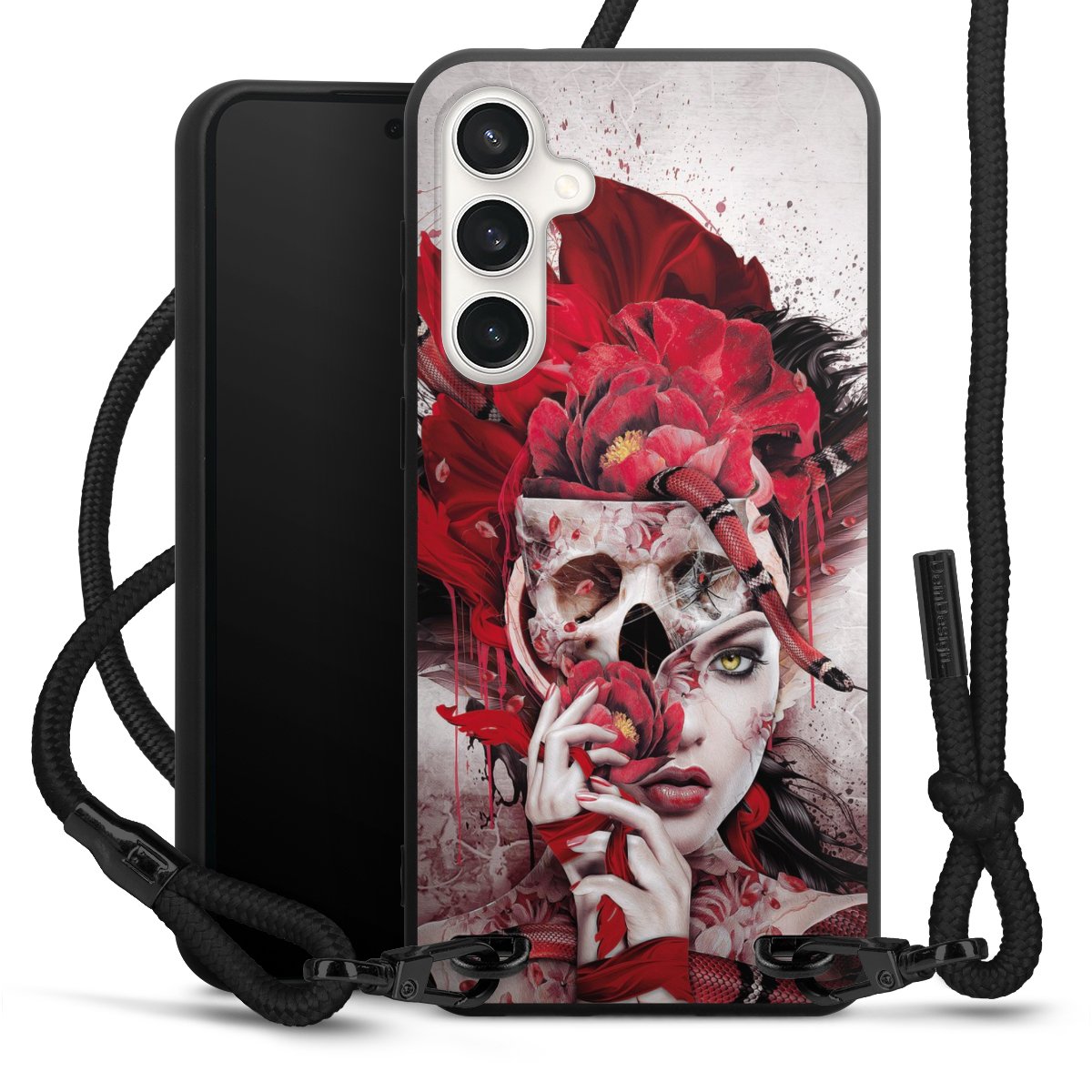 The matt black silicone case is made of flexible TPU (thermoplastic polyurethane) and offers robust protection. The durable, unbreakable material makes the cover flexible and dimensionally stable at the same time. The matte surface makes your design stand out more and is less susceptible to fingerprints and dirt. The stylish trend accessory fits comfortably in the hand and is perfectly complemented by the fabric (polyester) mobile phone strap. The braided fabric strap is approx. 1.70 metres long with a diameter of approx. 0.5 cm. Due to the special knotting technique, the length of the strap can be adjusted by simply pulling it, so that you can adapt it individually to your wishes. The practical case to wear around your neck is available with the fabric strap in black. As a little icing on the cake, we have provided the strap with a chic metal fastener in matt black. The strap is securely fastened to the case with loops made of high-quality genuine leather and press studs. The ends of the fabric strap are covered with metallic end caps and thus protected from fraying.