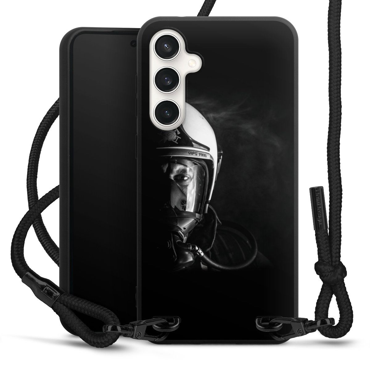 The matt black silicone case is made of flexible TPU (thermoplastic polyurethane) and offers robust protection. The durable, unbreakable material makes the cover flexible and dimensionally stable at the same time. The matte surface makes your design stand out more and is less susceptible to fingerprints and dirt. The stylish trend accessory fits comfortably in the hand and is perfectly complemented by the fabric (polyester) mobile phone strap. The braided fabric strap is approx. 1.70 metres long with a diameter of approx. 0.5 cm. Due to the special knotting technique, the length of the strap can be adjusted by simply pulling it, so that you can adapt it individually to your wishes. The practical case to wear around your neck is available with the fabric strap in black. As a little icing on the cake, we have provided the strap with a chic metal fastener in matt black. The strap is securely fastened to the case with loops made of high-quality genuine leather and press studs. The ends of the fabric strap are covered with metallic end caps and thus protected from fraying.