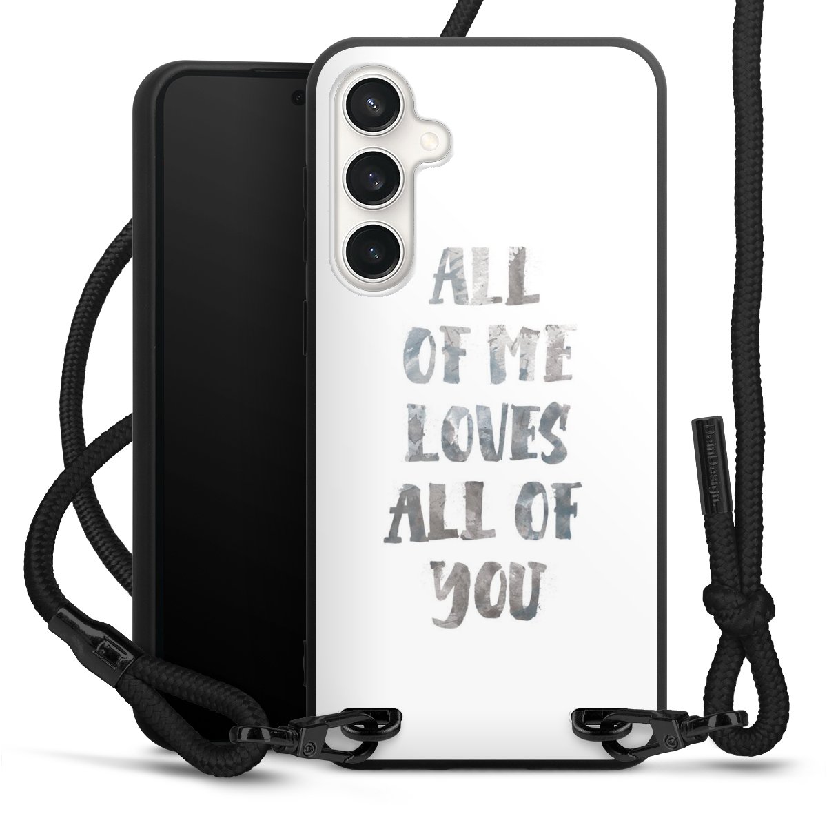 The matt black silicone case is made of flexible TPU (thermoplastic polyurethane) and offers robust protection. The durable, unbreakable material makes the cover flexible and dimensionally stable at the same time. The matte surface makes your design stand out more and is less susceptible to fingerprints and dirt. The stylish trend accessory fits comfortably in the hand and is perfectly complemented by the fabric (polyester) mobile phone strap. The braided fabric strap is approx. 1.70 metres long with a diameter of approx. 0.5 cm. Due to the special knotting technique, the length of the strap can be adjusted by simply pulling it, so that you can adapt it individually to your wishes. The practical case to wear around your neck is available with the fabric strap in black. As a little icing on the cake, we have provided the strap with a chic metal fastener in matt black. The strap is securely fastened to the case with loops made of high-quality genuine leather and press studs. The ends of the fabric strap are covered with metallic end caps and thus protected from fraying.