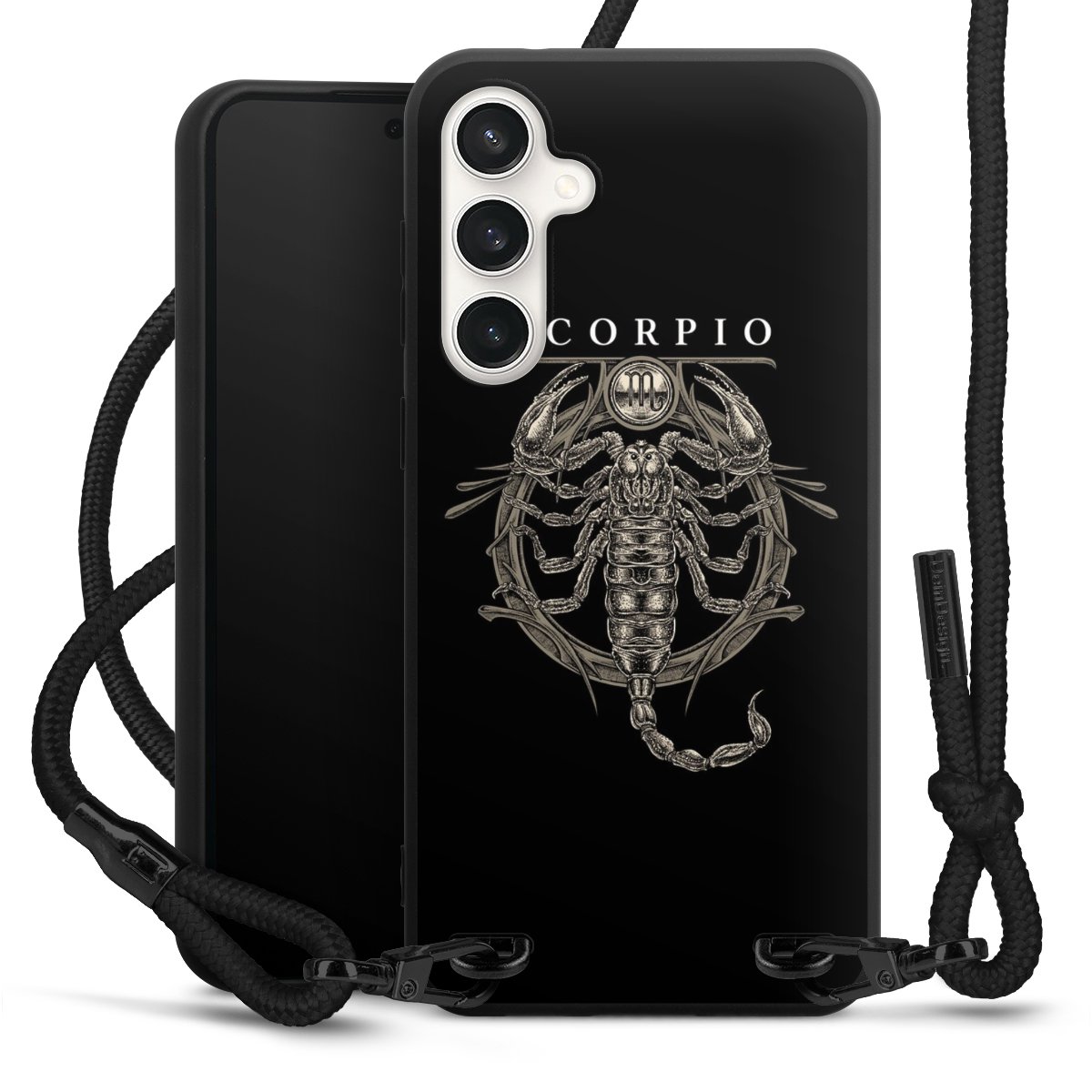 The matt black silicone case is made of flexible TPU (thermoplastic polyurethane) and offers robust protection. The durable, unbreakable material makes the cover flexible and dimensionally stable at the same time. The matte surface makes your design stand out more and is less susceptible to fingerprints and dirt. The stylish trend accessory fits comfortably in the hand and is perfectly complemented by the fabric (polyester) mobile phone strap. The braided fabric strap is approx. 1.70 metres long with a diameter of approx. 0.5 cm. Due to the special knotting technique, the length of the strap can be adjusted by simply pulling it, so that you can adapt it individually to your wishes. The practical case to wear around your neck is available with the fabric strap in black. As a little icing on the cake, we have provided the strap with a chic metal fastener in matt black. The strap is securely fastened to the case with loops made of high-quality genuine leather and press studs. The ends of the fabric strap are covered with metallic end caps and thus protected from fraying.
