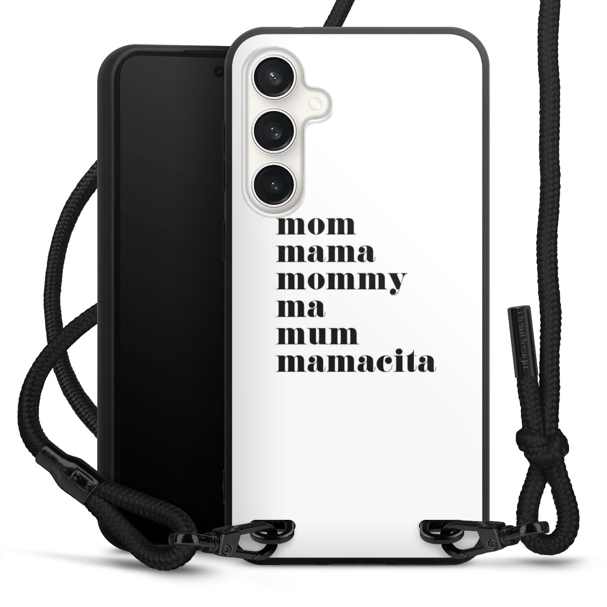 The matt black silicone case is made of flexible TPU (thermoplastic polyurethane) and offers robust protection. The durable, unbreakable material makes the cover flexible and dimensionally stable at the same time. The matte surface makes your design stand out more and is less susceptible to fingerprints and dirt. The stylish trend accessory fits comfortably in the hand and is perfectly complemented by the fabric (polyester) mobile phone strap. The braided fabric strap is approx. 1.70 metres long with a diameter of approx. 0.5 cm. Due to the special knotting technique, the length of the strap can be adjusted by simply pulling it, so that you can adapt it individually to your wishes. The practical case to wear around your neck is available with the fabric strap in black. As a little icing on the cake, we have provided the strap with a chic metal fastener in matt black. The strap is securely fastened to the case with loops made of high-quality genuine leather and press studs. The ends of the fabric strap are covered with metallic end caps and thus protected from fraying.