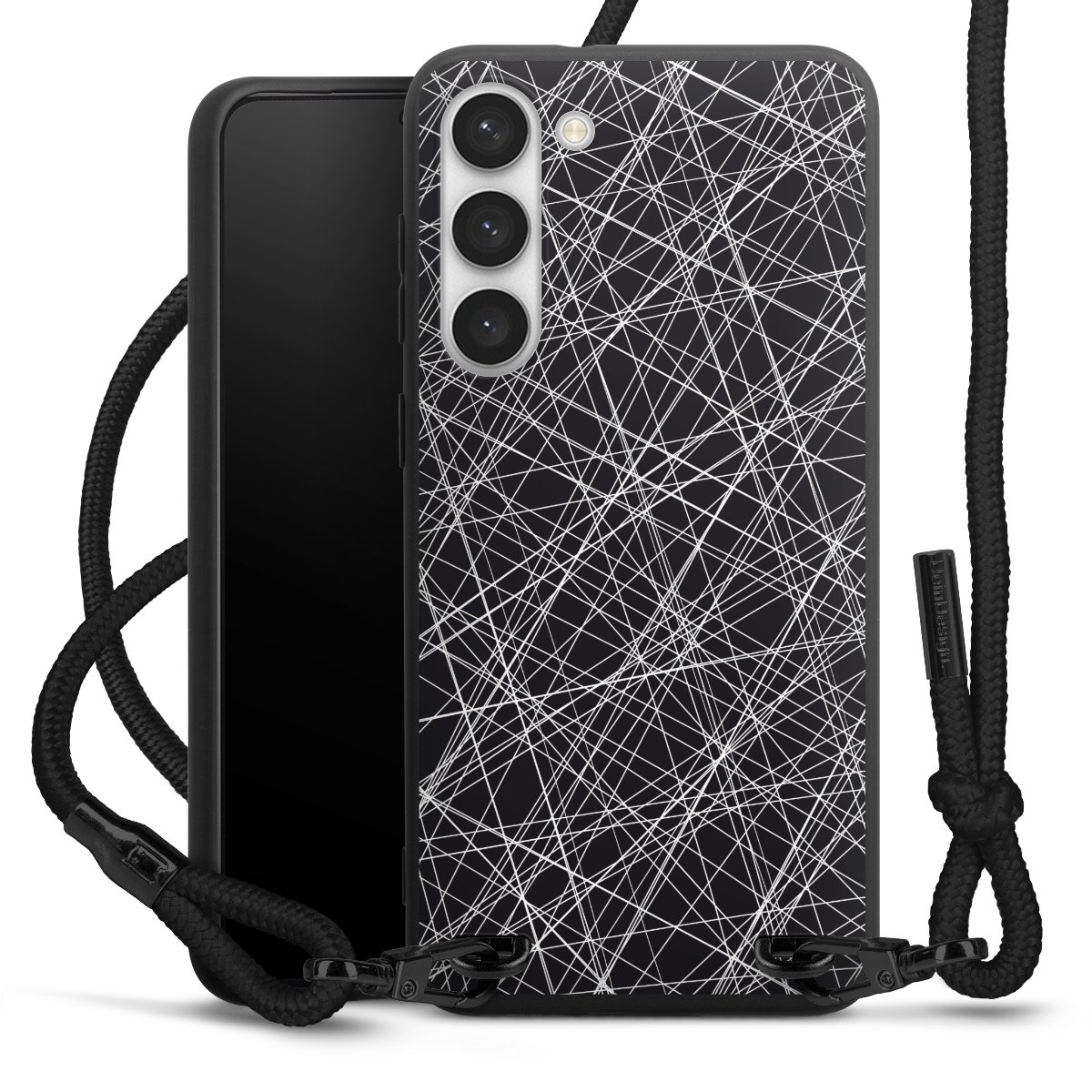 The matt black silicone case is made of flexible TPU (thermoplastic polyurethane) and offers robust protection. The durable, unbreakable material makes the cover flexible and dimensionally stable at the same time. The matte surface makes your design stand out more and is less susceptible to fingerprints and dirt. The stylish trend accessory fits comfortably in the hand and is perfectly complemented by the fabric (polyester) mobile phone strap. The braided fabric strap is approx. 1.70 metres long with a diameter of approx. 0.5 cm. Due to the special knotting technique, the length of the strap can be adjusted by simply pulling it, so that you can adapt it individually to your wishes. The practical case to wear around your neck is available with the fabric strap in black. As a little icing on the cake, we have provided the strap with a chic metal fastener in matt black. The strap is securely fastened to the case with loops made of high-quality genuine leather and press studs. The ends of the fabric strap are covered with metallic end caps and thus protected from fraying.