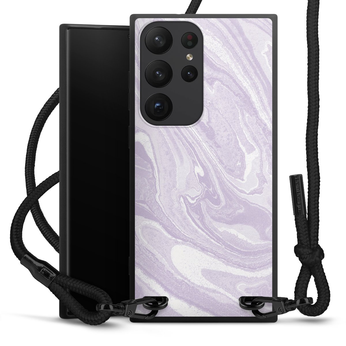The matt black silicone case is made of flexible TPU (thermoplastic polyurethane) and offers robust protection. The durable, unbreakable material makes the cover flexible and dimensionally stable at the same time. The matte surface makes your design stand out more and is less susceptible to fingerprints and dirt. The stylish trend accessory fits comfortably in the hand and is perfectly complemented by the fabric (polyester) mobile phone strap. The braided fabric strap is approx. 1.70 metres long with a diameter of approx. 0.5 cm. Due to the special knotting technique, the length of the strap can be adjusted by simply pulling it, so that you can adapt it individually to your wishes. The practical case to wear around your neck is available with the fabric strap in black. As a little icing on the cake, we have provided the strap with a chic metal fastener in matt black. The strap is securely fastened to the case with loops made of high-quality genuine leather and press studs. The ends of the fabric strap are covered with metallic end caps and thus protected from fraying.