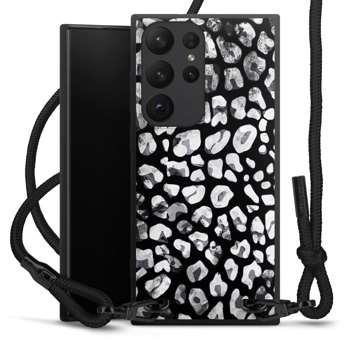 The matt black silicone case is made of flexible TPU (thermoplastic polyurethane) and offers robust protection. The durable, unbreakable material makes the cover flexible and dimensionally stable at the same time. The matte surface makes your design stand out more and is less susceptible to fingerprints and dirt. The stylish trend accessory fits comfortably in the hand and is perfectly complemented by the fabric (polyester) mobile phone strap. The braided fabric strap is approx. 1.70 metres long with a diameter of approx. 0.5 cm. Due to the special knotting technique, the length of the strap can be adjusted by simply pulling it, so that you can adapt it individually to your wishes. The practical case to wear around your neck is available with the fabric strap in black. As a little icing on the cake, we have provided the strap with a chic metal fastener in matt black. The strap is securely fastened to the case with loops made of high-quality genuine leather and press studs. The ends of the fabric strap are covered with metallic end caps and thus protected from fraying.