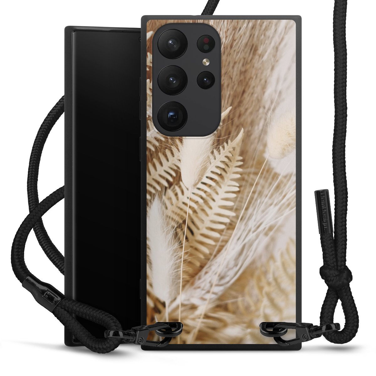 The matt black silicone case is made of flexible TPU (thermoplastic polyurethane) and offers robust protection. The durable, unbreakable material makes the cover flexible and dimensionally stable at the same time. The matte surface makes your design stand out more and is less susceptible to fingerprints and dirt. The stylish trend accessory fits comfortably in the hand and is perfectly complemented by the fabric (polyester) mobile phone strap. The braided fabric strap is approx. 1.70 metres long with a diameter of approx. 0.5 cm. Due to the special knotting technique, the length of the strap can be adjusted by simply pulling it, so that you can adapt it individually to your wishes. The practical case to wear around your neck is available with the fabric strap in black. As a little icing on the cake, we have provided the strap with a chic metal fastener in matt black. The strap is securely fastened to the case with loops made of high-quality genuine leather and press studs. The ends of the fabric strap are covered with metallic end caps and thus protected from fraying.