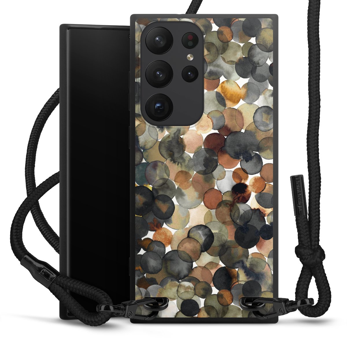 The matt black silicone case is made of flexible TPU (thermoplastic polyurethane) and offers robust protection. The durable, unbreakable material makes the cover flexible and dimensionally stable at the same time. The matte surface makes your design stand out more and is less susceptible to fingerprints and dirt. The stylish trend accessory fits comfortably in the hand and is perfectly complemented by the fabric (polyester) mobile phone strap. The braided fabric strap is approx. 1.70 metres long with a diameter of approx. 0.5 cm. Due to the special knotting technique, the length of the strap can be adjusted by simply pulling it, so that you can adapt it individually to your wishes. The practical case to wear around your neck is available with the fabric strap in black. As a little icing on the cake, we have provided the strap with a chic metal fastener in matt black. The strap is securely fastened to the case with loops made of high-quality genuine leather and press studs. The ends of the fabric strap are covered with metallic end caps and thus protected from fraying.