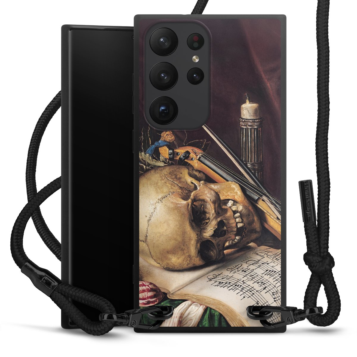 The matt black silicone case is made of flexible TPU (thermoplastic polyurethane) and offers robust protection. The durable, unbreakable material makes the cover flexible and dimensionally stable at the same time. The matte surface makes your design stand out more and is less susceptible to fingerprints and dirt. The stylish trend accessory fits comfortably in the hand and is perfectly complemented by the fabric (polyester) mobile phone strap. The braided fabric strap is approx. 1.70 metres long with a diameter of approx. 0.5 cm. Due to the special knotting technique, the length of the strap can be adjusted by simply pulling it, so that you can adapt it individually to your wishes. The practical case to wear around your neck is available with the fabric strap in black. As a little icing on the cake, we have provided the strap with a chic metal fastener in matt black. The strap is securely fastened to the case with loops made of high-quality genuine leather and press studs. The ends of the fabric strap are covered with metallic end caps and thus protected from fraying.