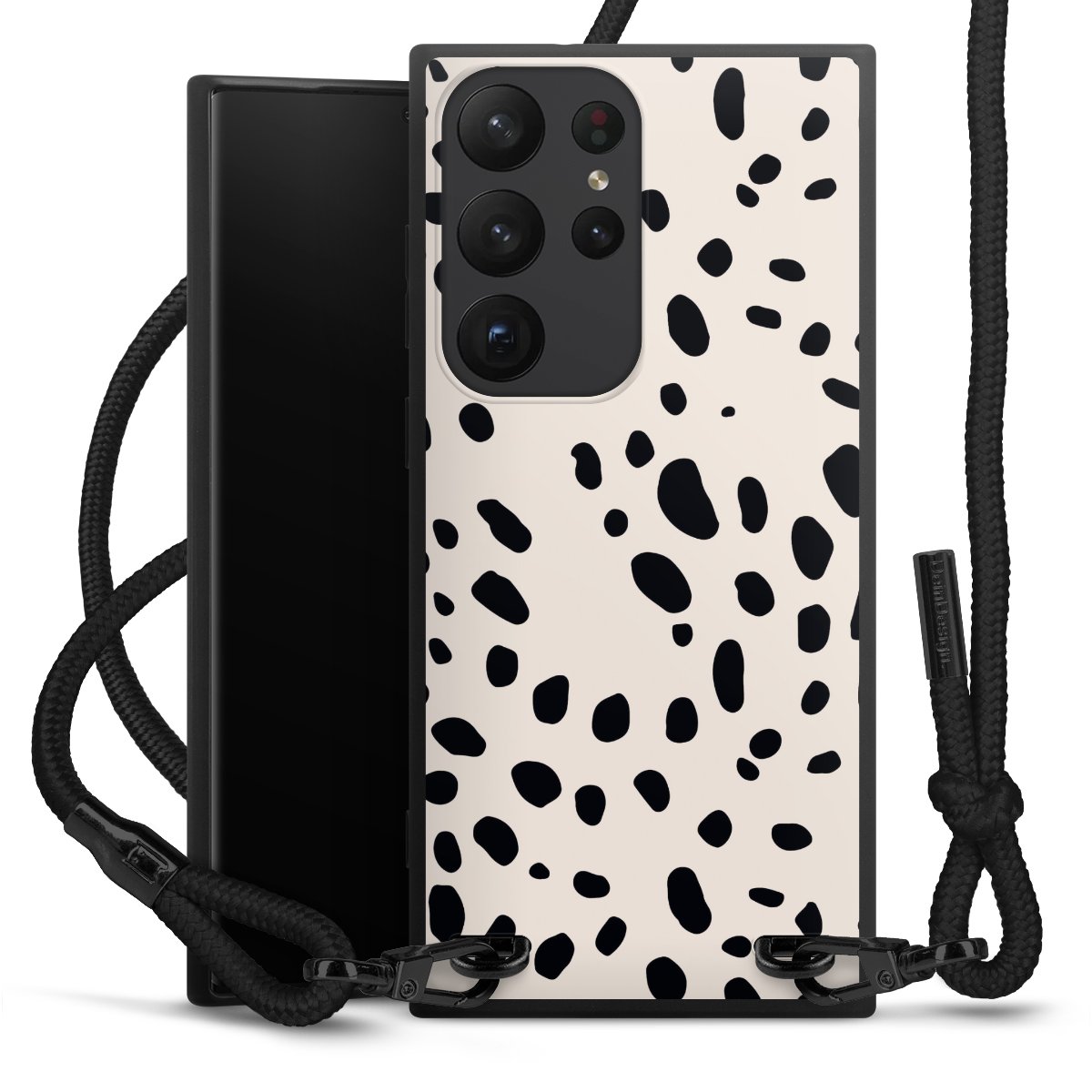 The matt black silicone case is made of flexible TPU (thermoplastic polyurethane) and offers robust protection. The durable, unbreakable material makes the cover flexible and dimensionally stable at the same time. The matte surface makes your design stand out more and is less susceptible to fingerprints and dirt. The stylish trend accessory fits comfortably in the hand and is perfectly complemented by the fabric (polyester) mobile phone strap. The braided fabric strap is approx. 1.70 metres long with a diameter of approx. 0.5 cm. Due to the special knotting technique, the length of the strap can be adjusted by simply pulling it, so that you can adapt it individually to your wishes. The practical case to wear around your neck is available with the fabric strap in black. As a little icing on the cake, we have provided the strap with a chic metal fastener in matt black. The strap is securely fastened to the case with loops made of high-quality genuine leather and press studs. The ends of the fabric strap are covered with metallic end caps and thus protected from fraying.