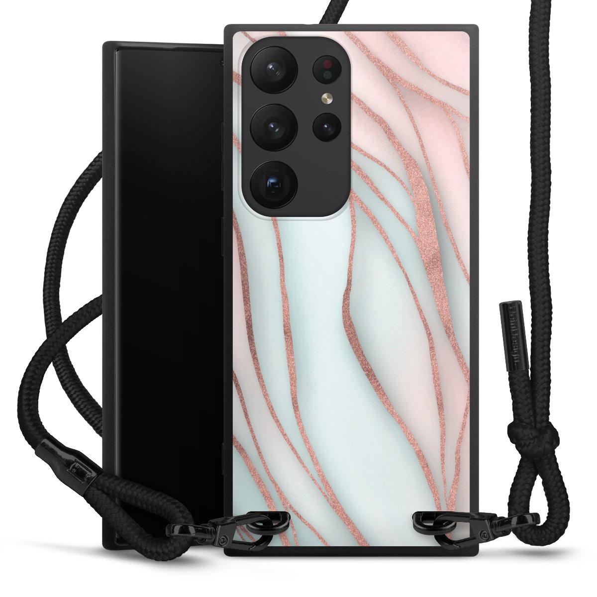 The matt black silicone case is made of flexible TPU (thermoplastic polyurethane) and offers robust protection. The durable, unbreakable material makes the cover flexible and dimensionally stable at the same time. The matte surface makes your design stand out more and is less susceptible to fingerprints and dirt. The stylish trend accessory fits comfortably in the hand and is perfectly complemented by the fabric (polyester) mobile phone strap. The braided fabric strap is approx. 1.70 metres long with a diameter of approx. 0.5 cm. Due to the special knotting technique, the length of the strap can be adjusted by simply pulling it, so that you can adapt it individually to your wishes. The practical case to wear around your neck is available with the fabric strap in black. As a little icing on the cake, we have provided the strap with a chic metal fastener in matt black. The strap is securely fastened to the case with loops made of high-quality genuine leather and press studs. The ends of the fabric strap are covered with metallic end caps and thus protected from fraying.