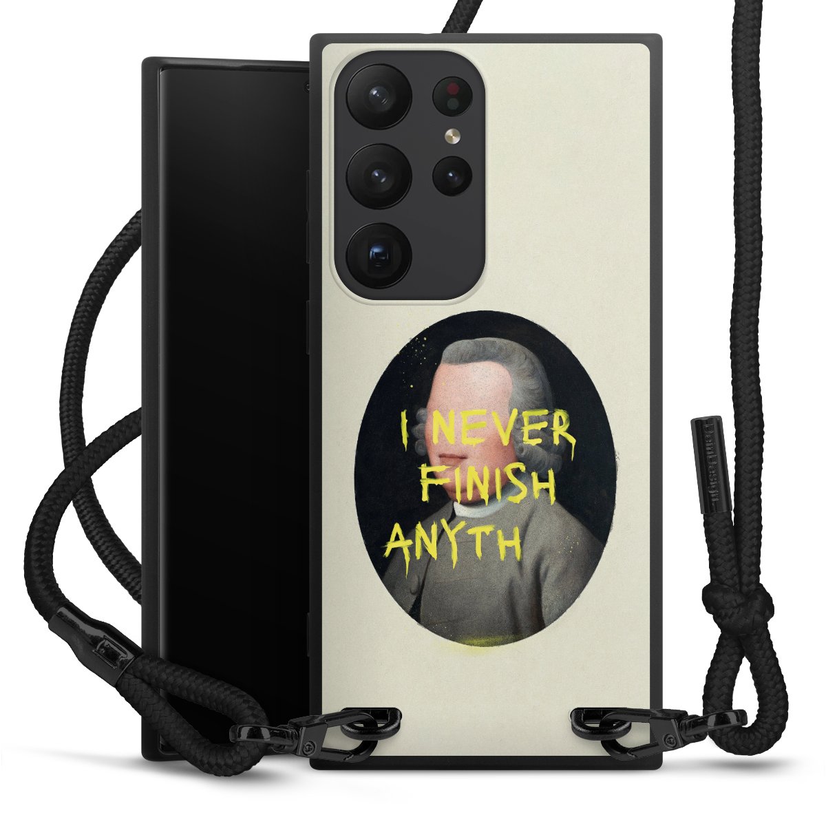 The matt black silicone case is made of flexible TPU (thermoplastic polyurethane) and offers robust protection. The durable, unbreakable material makes the cover flexible and dimensionally stable at the same time. The matte surface makes your design stand out more and is less susceptible to fingerprints and dirt. The stylish trend accessory fits comfortably in the hand and is perfectly complemented by the fabric (polyester) mobile phone strap. The braided fabric strap is approx. 1.70 metres long with a diameter of approx. 0.5 cm. Due to the special knotting technique, the length of the strap can be adjusted by simply pulling it, so that you can adapt it individually to your wishes. The practical case to wear around your neck is available with the fabric strap in black. As a little icing on the cake, we have provided the strap with a chic metal fastener in matt black. The strap is securely fastened to the case with loops made of high-quality genuine leather and press studs. The ends of the fabric strap are covered with metallic end caps and thus protected from fraying.