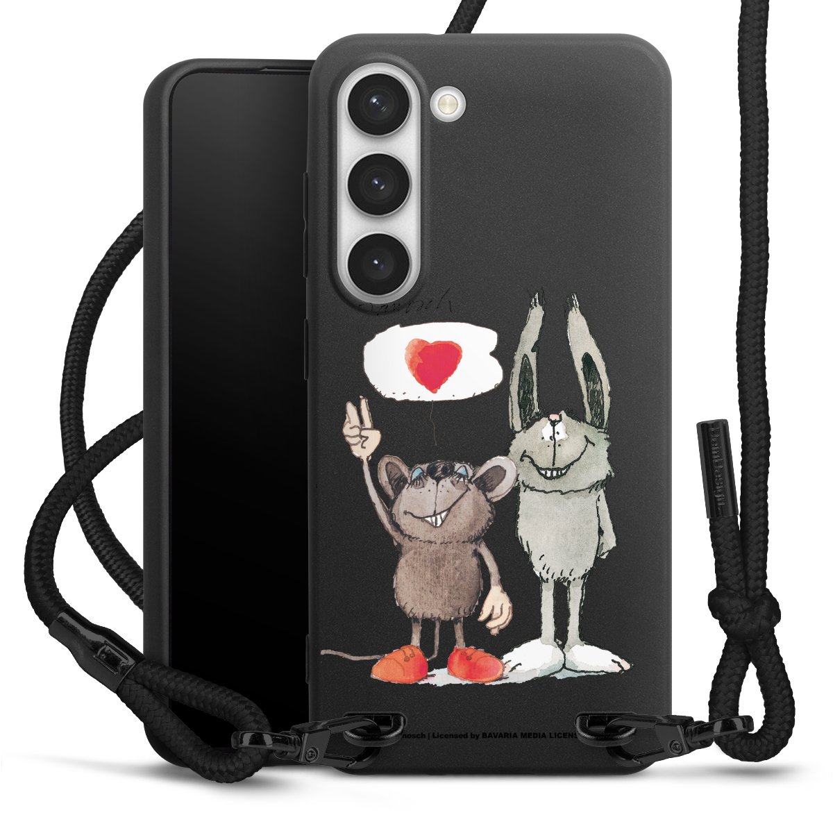 The matt black silicone case is made of flexible TPU (thermoplastic polyurethane) and offers robust protection. The durable, unbreakable material makes the cover flexible and dimensionally stable at the same time. The matte surface makes your design stand out more and is less susceptible to fingerprints and dirt. The stylish trend accessory fits comfortably in the hand and is perfectly complemented by the fabric (polyester) mobile phone strap. The braided fabric strap is approx. 1.70 metres long with a diameter of approx. 0.5 cm. Due to the special knotting technique, the length of the strap can be adjusted by simply pulling it, so that you can adapt it individually to your wishes. The practical case to wear around your neck is available with the fabric strap in black. As a little icing on the cake, we have provided the strap with a chic metal fastener in matt black. The strap is securely fastened to the case with loops made of high-quality genuine leather and press studs. The ends of the fabric strap are covered with metallic end caps and thus protected from fraying.