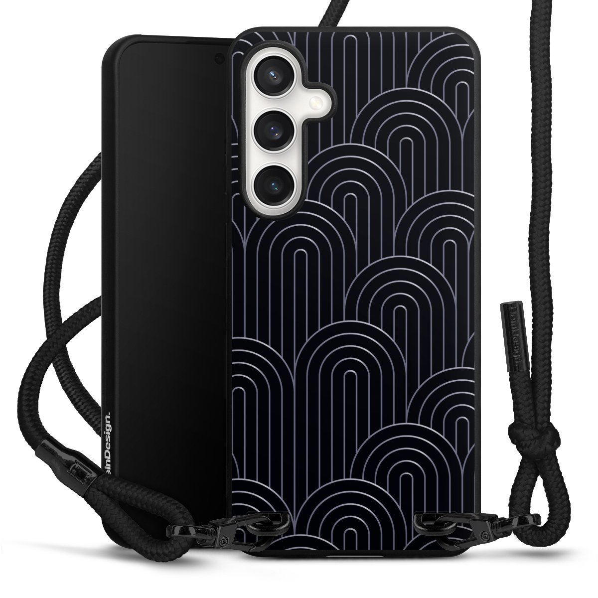 The matt black silicone case is made of flexible TPU (thermoplastic polyurethane) and offers robust protection. The durable, unbreakable material makes the cover flexible and dimensionally stable at the same time. The matte surface makes your design stand out more and is less susceptible to fingerprints and dirt. The stylish trend accessory fits comfortably in the hand and is perfectly complemented by the fabric (polyester) mobile phone strap. The braided fabric strap is approx. 1.70 metres long with a diameter of approx. 0.5 cm. Due to the special knotting technique, the length of the strap can be adjusted by simply pulling it, so that you can adapt it individually to your wishes. The practical case to wear around your neck is available with the fabric strap in black. As a little icing on the cake, we have provided the strap with a chic metal fastener in matt black. The strap is securely fastened to the case with loops made of high-quality genuine leather and press studs. The ends of the fabric strap are covered with metallic end caps and thus protected from fraying.