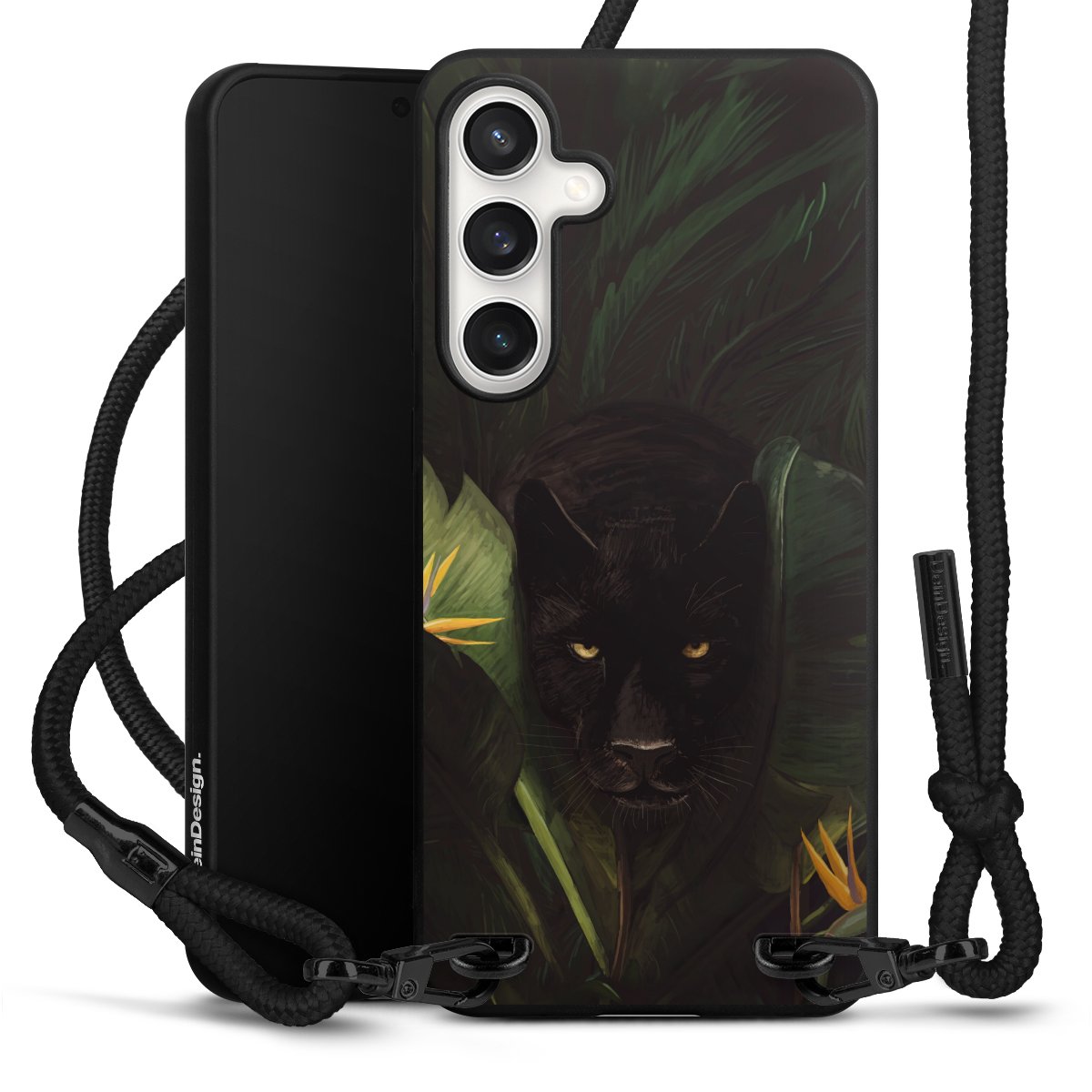 The matt black silicone case is made of flexible TPU (thermoplastic polyurethane) and offers robust protection. The durable, unbreakable material makes the cover flexible and dimensionally stable at the same time. The matte surface makes your design stand out more and is less susceptible to fingerprints and dirt. The stylish trend accessory fits comfortably in the hand and is perfectly complemented by the fabric (polyester) mobile phone strap. The braided fabric strap is approx. 1.70 metres long with a diameter of approx. 0.5 cm. Due to the special knotting technique, the length of the strap can be adjusted by simply pulling it, so that you can adapt it individually to your wishes. The practical case to wear around your neck is available with the fabric strap in black. As a little icing on the cake, we have provided the strap with a chic metal fastener in matt black. The strap is securely fastened to the case with loops made of high-quality genuine leather and press studs. The ends of the fabric strap are covered with metallic end caps and thus protected from fraying.