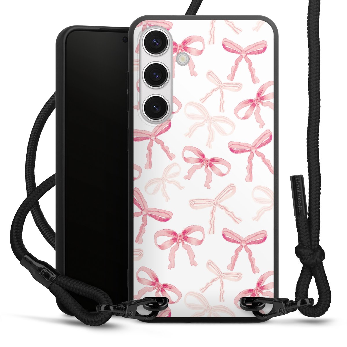 The matt black silicone case is made of flexible TPU (thermoplastic polyurethane) and offers robust protection. The durable, unbreakable material makes the cover flexible and dimensionally stable at the same time. The matte surface makes your design stand out more and is less susceptible to fingerprints and dirt. The stylish trend accessory fits comfortably in the hand and is perfectly complemented by the fabric (polyester) mobile phone strap. The braided fabric strap is approx. 1.70 metres long with a diameter of approx. 0.5 cm. Due to the special knotting technique, the length of the strap can be adjusted by simply pulling it, so that you can adapt it individually to your wishes. The practical case to wear around your neck is available with the fabric strap in black. As a little icing on the cake, we have provided the strap with a chic metal fastener in matt black. The strap is securely fastened to the case with loops made of high-quality genuine leather and press studs. The ends of the fabric strap are covered with metallic end caps and thus protected from fraying.