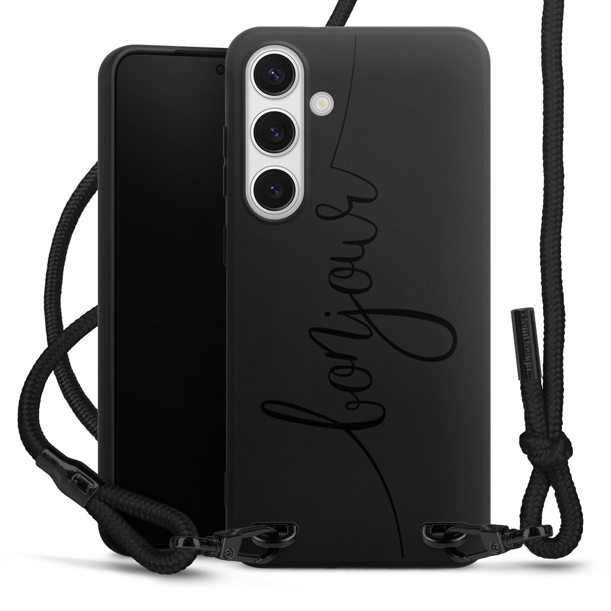 The matt black silicone case is made of flexible TPU (thermoplastic polyurethane) and offers robust protection. The durable, unbreakable material makes the cover flexible and dimensionally stable at the same time. The matte surface makes your design stand out more and is less susceptible to fingerprints and dirt. The stylish trend accessory fits comfortably in the hand and is perfectly complemented by the fabric (polyester) mobile phone strap. The braided fabric strap is approx. 1.70 metres long with a diameter of approx. 0.5 cm. Due to the special knotting technique, the length of the strap can be adjusted by simply pulling it, so that you can adapt it individually to your wishes. The practical case to wear around your neck is available with the fabric strap in black. As a little icing on the cake, we have provided the strap with a chic metal fastener in matt black. The strap is securely fastened to the case with loops made of high-quality genuine leather and press studs. The ends of the fabric strap are covered with metallic end caps and thus protected from fraying.