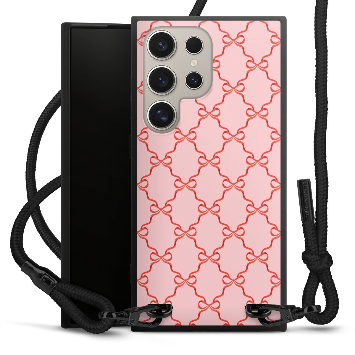 The matt black silicone case is made of flexible TPU (thermoplastic polyurethane) and offers robust protection. The durable, unbreakable material makes the cover flexible and dimensionally stable at the same time. The matte surface makes your design stand out more and is less susceptible to fingerprints and dirt. The stylish trend accessory fits comfortably in the hand and is perfectly complemented by the fabric (polyester) mobile phone strap. The braided fabric strap is approx. 1.70 metres long with a diameter of approx. 0.5 cm. Due to the special knotting technique, the length of the strap can be adjusted by simply pulling it, so that you can adapt it individually to your wishes. The practical case to wear around your neck is available with the fabric strap in black. As a little icing on the cake, we have provided the strap with a chic metal fastener in matt black. The strap is securely fastened to the case with loops made of high-quality genuine leather and press studs. The ends of the fabric strap are covered with metallic end caps and thus protected from fraying.