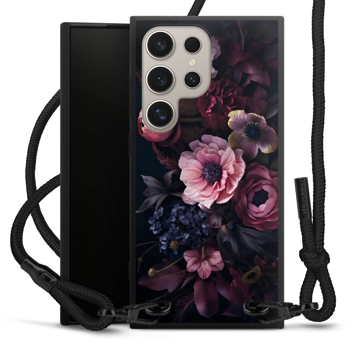 The matt black silicone case is made of flexible TPU (thermoplastic polyurethane) and offers robust protection. The durable, unbreakable material makes the cover flexible and dimensionally stable at the same time. The matte surface makes your design stand out more and is less susceptible to fingerprints and dirt. The stylish trend accessory fits comfortably in the hand and is perfectly complemented by the fabric (polyester) mobile phone strap. The braided fabric strap is approx. 1.70 metres long with a diameter of approx. 0.5 cm. Due to the special knotting technique, the length of the strap can be adjusted by simply pulling it, so that you can adapt it individually to your wishes. The practical case to wear around your neck is available with the fabric strap in black. As a little icing on the cake, we have provided the strap with a chic metal fastener in matt black. The strap is securely fastened to the case with loops made of high-quality genuine leather and press studs. The ends of the fabric strap are covered with metallic end caps and thus protected from fraying.