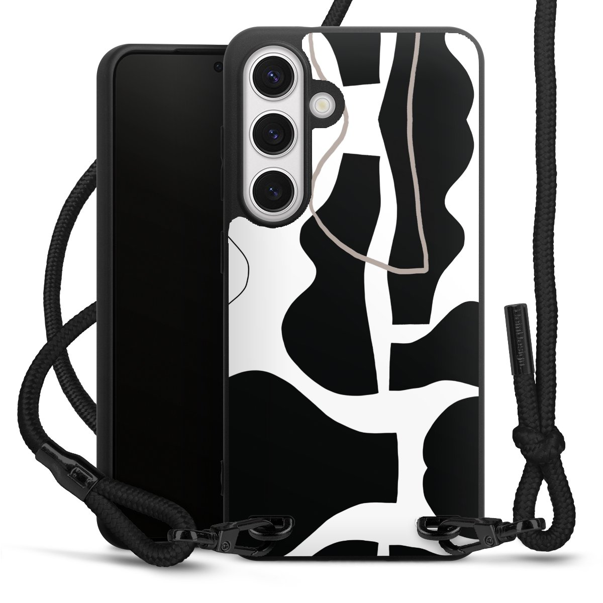 The matt black silicone case is made of flexible TPU (thermoplastic polyurethane) and offers robust protection. The durable, unbreakable material makes the cover flexible and dimensionally stable at the same time. The matte surface makes your design stand out more and is less susceptible to fingerprints and dirt. The stylish trend accessory fits comfortably in the hand and is perfectly complemented by the fabric (polyester) mobile phone strap. The braided fabric strap is approx. 1.70 metres long with a diameter of approx. 0.5 cm. Due to the special knotting technique, the length of the strap can be adjusted by simply pulling it, so that you can adapt it individually to your wishes. The practical case to wear around your neck is available with the fabric strap in black. As a little icing on the cake, we have provided the strap with a chic metal fastener in matt black. The strap is securely fastened to the case with loops made of high-quality genuine leather and press studs. The ends of the fabric strap are covered with metallic end caps and thus protected from fraying.