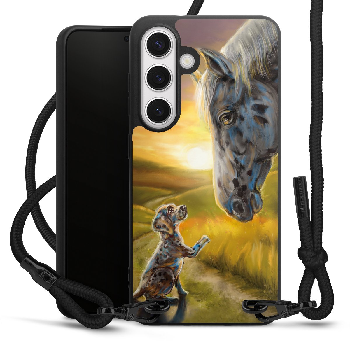 The matt black silicone case is made of flexible TPU (thermoplastic polyurethane) and offers robust protection. The durable, unbreakable material makes the cover flexible and dimensionally stable at the same time. The matte surface makes your design stand out more and is less susceptible to fingerprints and dirt. The stylish trend accessory fits comfortably in the hand and is perfectly complemented by the fabric (polyester) mobile phone strap. The braided fabric strap is approx. 1.70 metres long with a diameter of approx. 0.5 cm. Due to the special knotting technique, the length of the strap can be adjusted by simply pulling it, so that you can adapt it individually to your wishes. The practical case to wear around your neck is available with the fabric strap in black. As a little icing on the cake, we have provided the strap with a chic metal fastener in matt black. The strap is securely fastened to the case with loops made of high-quality genuine leather and press studs. The ends of the fabric strap are covered with metallic end caps and thus protected from fraying.