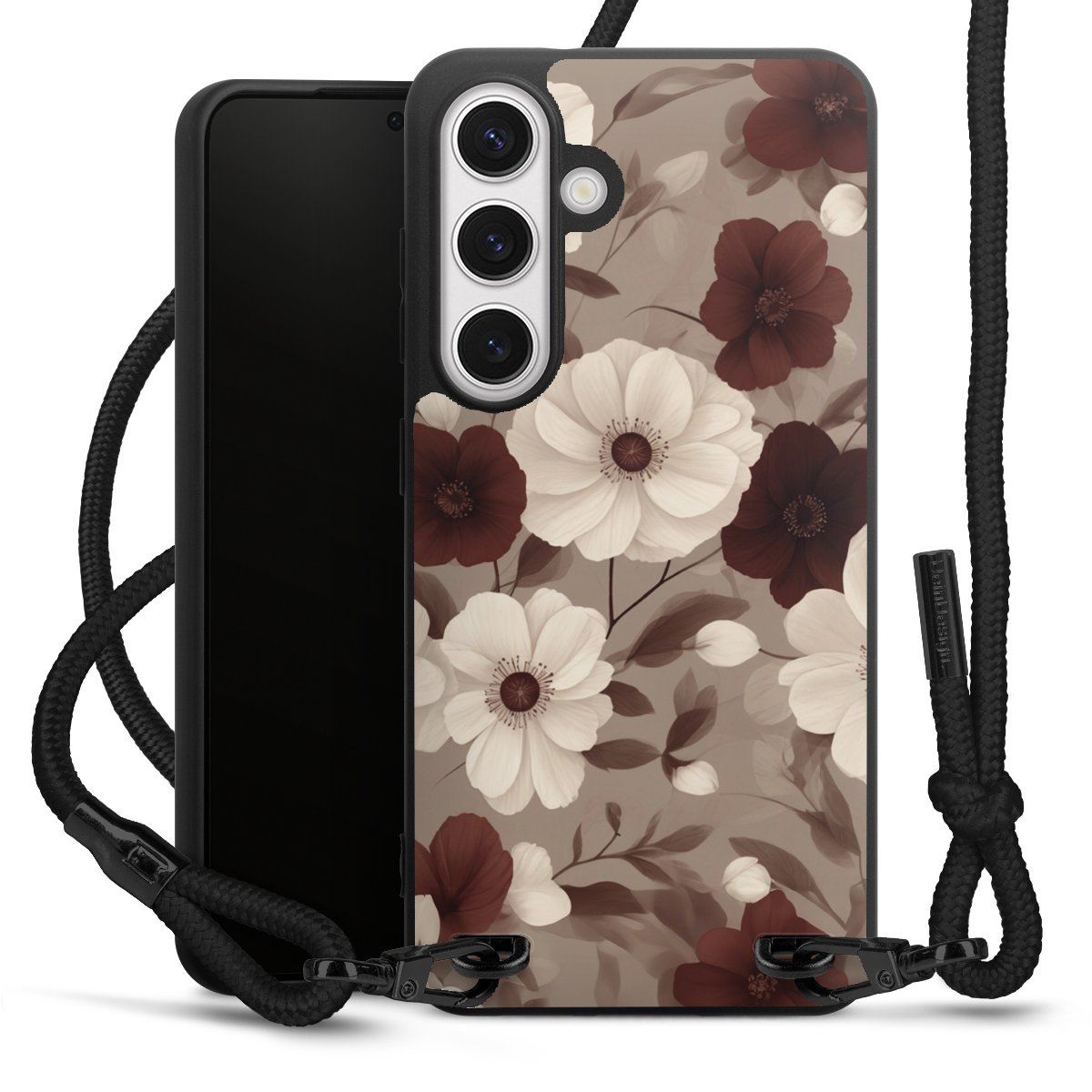 The matt black silicone case is made of flexible TPU (thermoplastic polyurethane) and offers robust protection. The durable, unbreakable material makes the cover flexible and dimensionally stable at the same time. The matte surface makes your design stand out more and is less susceptible to fingerprints and dirt. The stylish trend accessory fits comfortably in the hand and is perfectly complemented by the fabric (polyester) mobile phone strap. The braided fabric strap is approx. 1.70 metres long with a diameter of approx. 0.5 cm. Due to the special knotting technique, the length of the strap can be adjusted by simply pulling it, so that you can adapt it individually to your wishes. The practical case to wear around your neck is available with the fabric strap in black. As a little icing on the cake, we have provided the strap with a chic metal fastener in matt black. The strap is securely fastened to the case with loops made of high-quality genuine leather and press studs. The ends of the fabric strap are covered with metallic end caps and thus protected from fraying.