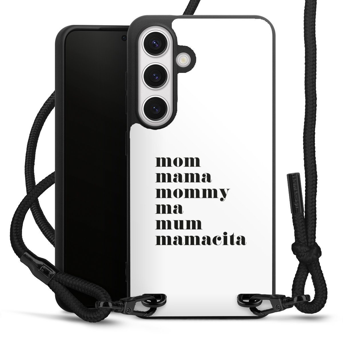 The matt black silicone case is made of flexible TPU (thermoplastic polyurethane) and offers robust protection. The durable, unbreakable material makes the cover flexible and dimensionally stable at the same time. The matte surface makes your design stand out more and is less susceptible to fingerprints and dirt. The stylish trend accessory fits comfortably in the hand and is perfectly complemented by the fabric (polyester) mobile phone strap. The braided fabric strap is approx. 1.70 metres long with a diameter of approx. 0.5 cm. Due to the special knotting technique, the length of the strap can be adjusted by simply pulling it, so that you can adapt it individually to your wishes. The practical case to wear around your neck is available with the fabric strap in black. As a little icing on the cake, we have provided the strap with a chic metal fastener in matt black. The strap is securely fastened to the case with loops made of high-quality genuine leather and press studs. The ends of the fabric strap are covered with metallic end caps and thus protected from fraying.