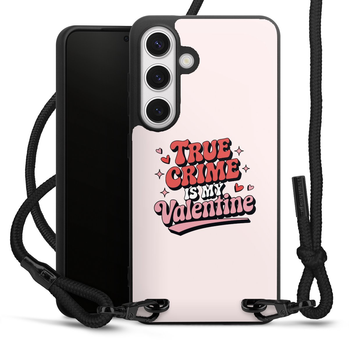 The matt black silicone case is made of flexible TPU (thermoplastic polyurethane) and offers robust protection. The durable, unbreakable material makes the cover flexible and dimensionally stable at the same time. The matte surface makes your design stand out more and is less susceptible to fingerprints and dirt. The stylish trend accessory fits comfortably in the hand and is perfectly complemented by the fabric (polyester) mobile phone strap. The braided fabric strap is approx. 1.70 metres long with a diameter of approx. 0.5 cm. Due to the special knotting technique, the length of the strap can be adjusted by simply pulling it, so that you can adapt it individually to your wishes. The practical case to wear around your neck is available with the fabric strap in black. As a little icing on the cake, we have provided the strap with a chic metal fastener in matt black. The strap is securely fastened to the case with loops made of high-quality genuine leather and press studs. The ends of the fabric strap are covered with metallic end caps and thus protected from fraying.