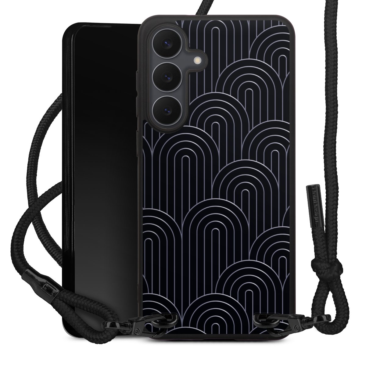 The matt black silicone case is made of flexible TPU (thermoplastic polyurethane) and offers robust protection. The durable, unbreakable material makes the cover flexible and dimensionally stable at the same time. The matte surface makes your design stand out more and is less susceptible to fingerprints and dirt. The stylish trend accessory fits comfortably in the hand and is perfectly complemented by the fabric (polyester) mobile phone strap. The braided fabric strap is approx. 1.70 metres long with a diameter of approx. 0.5 cm. Due to the special knotting technique, the length of the strap can be adjusted by simply pulling it, so that you can adapt it individually to your wishes. The practical case to wear around your neck is available with the fabric strap in black. As a little icing on the cake, we have provided the strap with a chic metal fastener in matt black. The strap is securely fastened to the case with loops made of high-quality genuine leather and press studs. The ends of the fabric strap are covered with metallic end caps and thus protected from fraying.