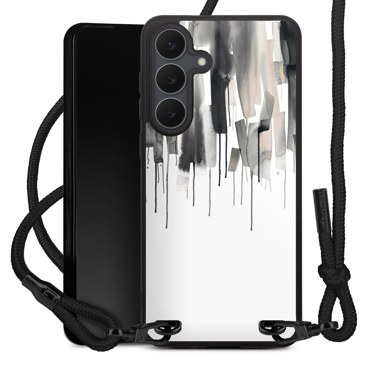 The matt black silicone case is made of flexible TPU (thermoplastic polyurethane) and offers robust protection. The durable, unbreakable material makes the cover flexible and dimensionally stable at the same time. The matte surface makes your design stand out more and is less susceptible to fingerprints and dirt. The stylish trend accessory fits comfortably in the hand and is perfectly complemented by the fabric (polyester) mobile phone strap. The braided fabric strap is approx. 1.70 metres long with a diameter of approx. 0.5 cm. Due to the special knotting technique, the length of the strap can be adjusted by simply pulling it, so that you can adapt it individually to your wishes. The practical case to wear around your neck is available with the fabric strap in black. As a little icing on the cake, we have provided the strap with a chic metal fastener in matt black. The strap is securely fastened to the case with loops made of high-quality genuine leather and press studs. The ends of the fabric strap are covered with metallic end caps and thus protected from fraying.