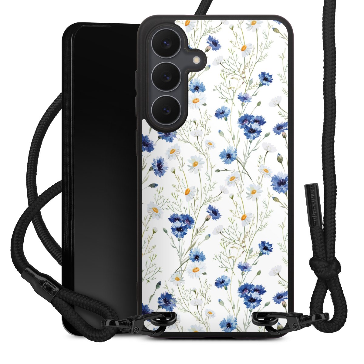 The matt black silicone case is made of flexible TPU (thermoplastic polyurethane) and offers robust protection. The durable, unbreakable material makes the cover flexible and dimensionally stable at the same time. The matte surface makes your design stand out more and is less susceptible to fingerprints and dirt. The stylish trend accessory fits comfortably in the hand and is perfectly complemented by the fabric (polyester) mobile phone strap. The braided fabric strap is approx. 1.70 metres long with a diameter of approx. 0.5 cm. Due to the special knotting technique, the length of the strap can be adjusted by simply pulling it, so that you can adapt it individually to your wishes. The practical case to wear around your neck is available with the fabric strap in black. As a little icing on the cake, we have provided the strap with a chic metal fastener in matt black. The strap is securely fastened to the case with loops made of high-quality genuine leather and press studs. The ends of the fabric strap are covered with metallic end caps and thus protected from fraying.