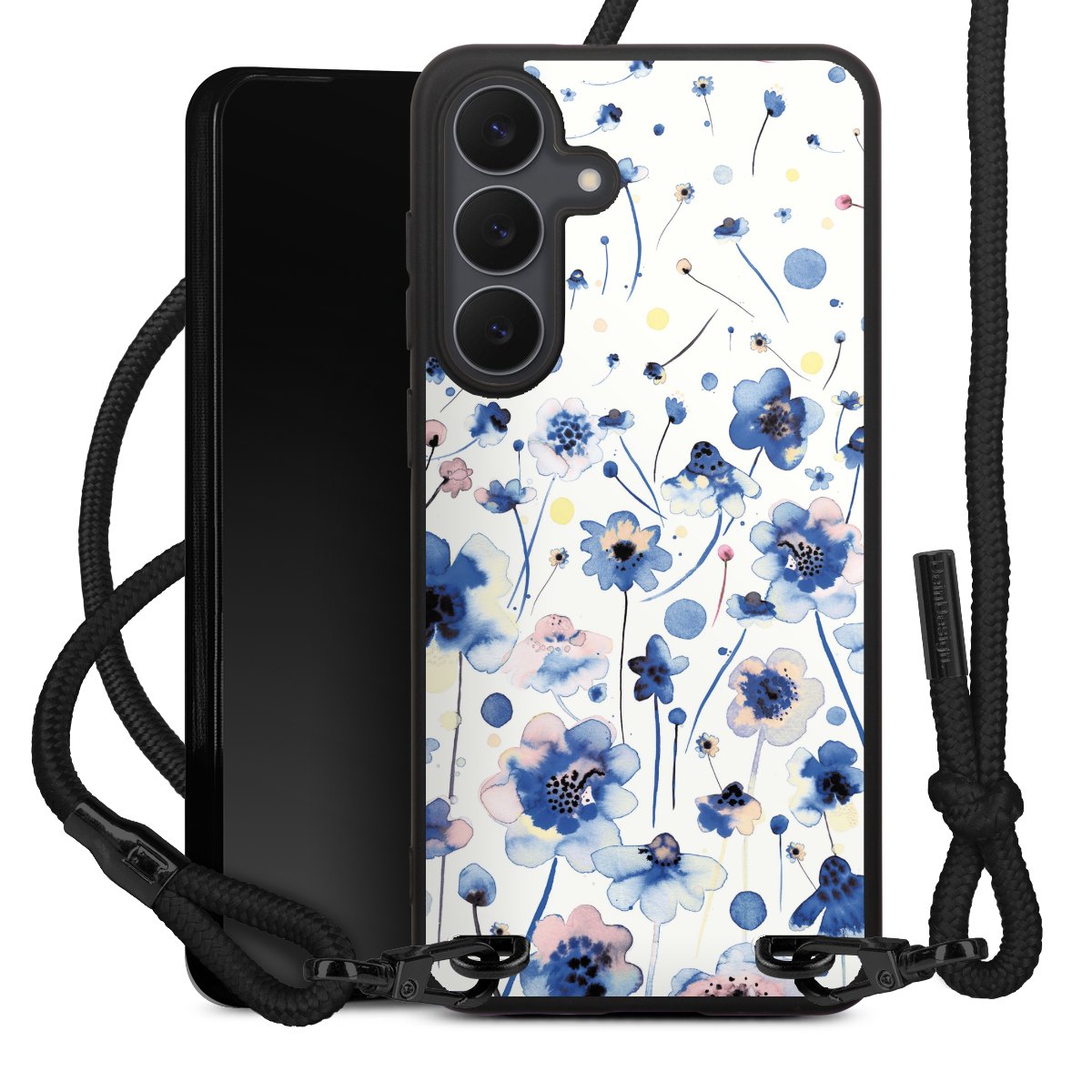 The matt black silicone case is made of flexible TPU (thermoplastic polyurethane) and offers robust protection. The durable, unbreakable material makes the cover flexible and dimensionally stable at the same time. The matte surface makes your design stand out more and is less susceptible to fingerprints and dirt. The stylish trend accessory fits comfortably in the hand and is perfectly complemented by the fabric (polyester) mobile phone strap. The braided fabric strap is approx. 1.70 metres long with a diameter of approx. 0.5 cm. Due to the special knotting technique, the length of the strap can be adjusted by simply pulling it, so that you can adapt it individually to your wishes. The practical case to wear around your neck is available with the fabric strap in black. As a little icing on the cake, we have provided the strap with a chic metal fastener in matt black. The strap is securely fastened to the case with loops made of high-quality genuine leather and press studs. The ends of the fabric strap are covered with metallic end caps and thus protected from fraying.